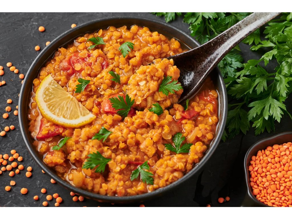 Červená čočka (38%), sekaná rajčata (17%) (rajčata, rajčatová šťáva, kyselina citrónová), cibule, sůl, kurkuma, garam masala, mletý koriandr, římský kmín, česnek, zázvor, chilli, čerstvý koriandr.