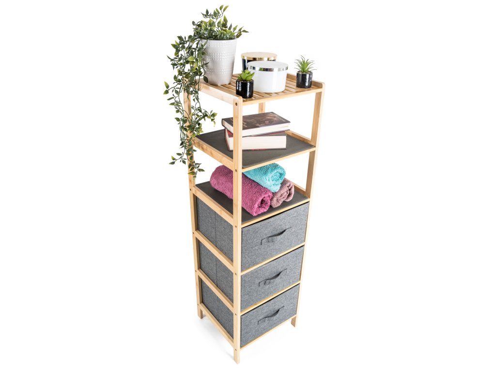 Bambusový regál s výsuvnými látkovými zásuvkami dodává interiéru příjemný přírodní dojem, pocit lehkosti a přirozenosti, zatímco jeho pevnost a dlouhá životnost zajišťují stabilitu a trvanlivost.