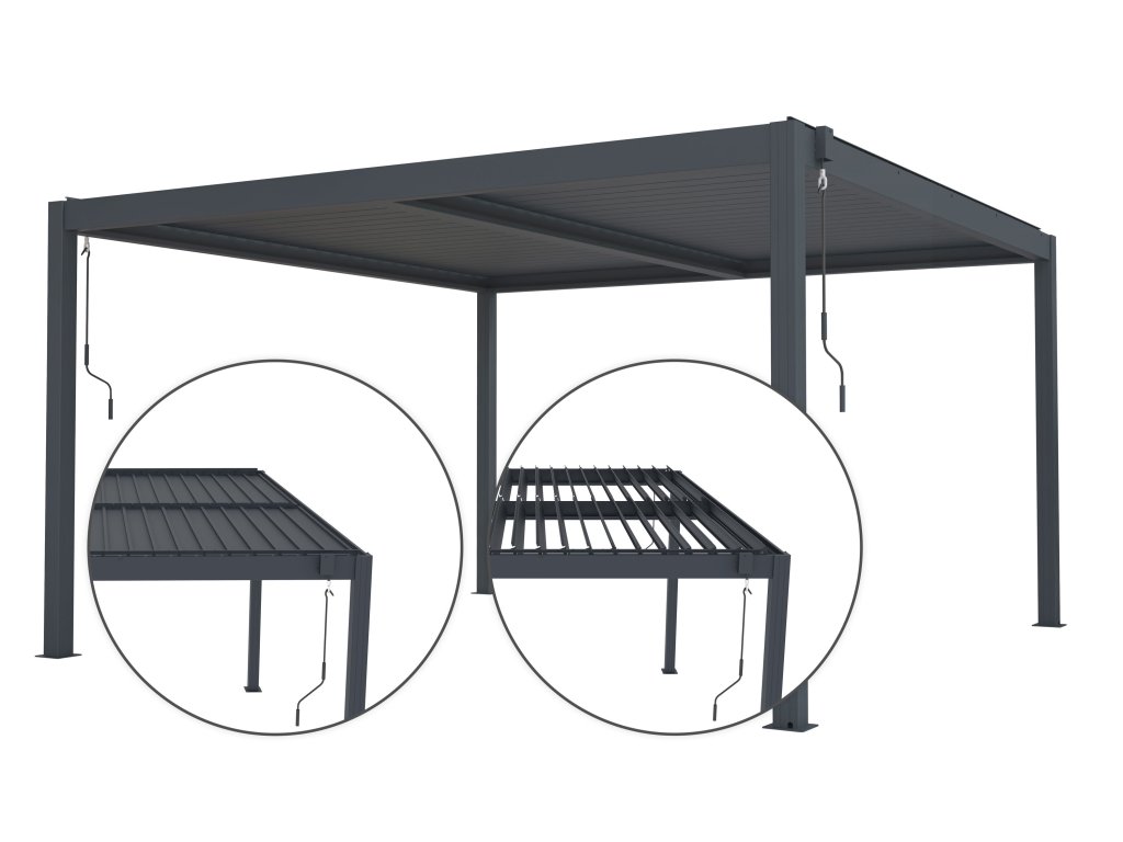 - Rotační střešní lamely pro manuální nastavení stínu, ventilace nebo ochrany před deštěm