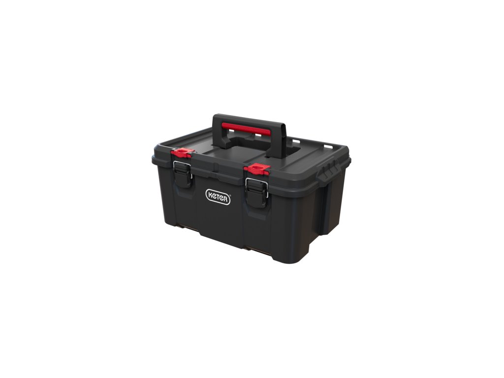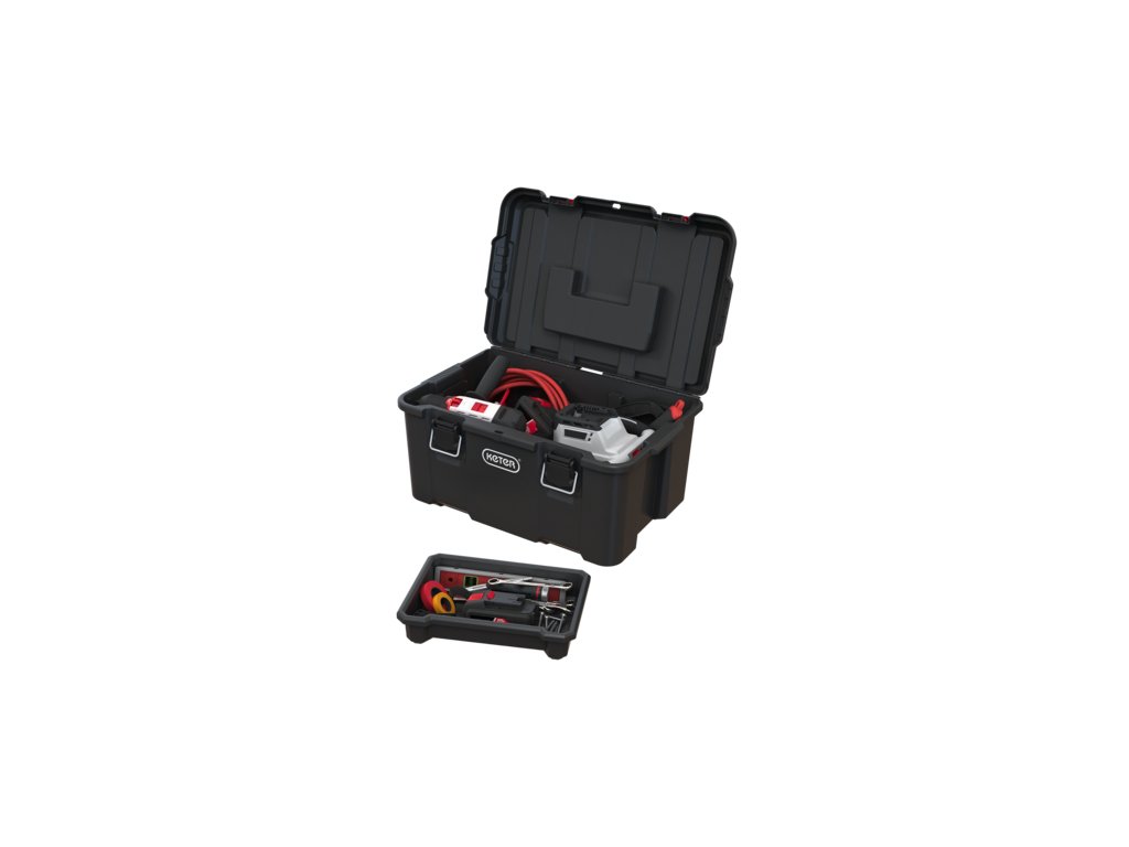 Přihrádka se dá vyjmout, čímž zvětšíte úložný prostor. Poté snadno do boxu uložíte i větší nářadí. Kovové spony zajistí pevné uzavření víka. Obsah boxu se vám tedy nevysype a zůstane v bezpečí. Rukojeť s měkkou gumou vám navíc zjednoduší jeho přenášení.