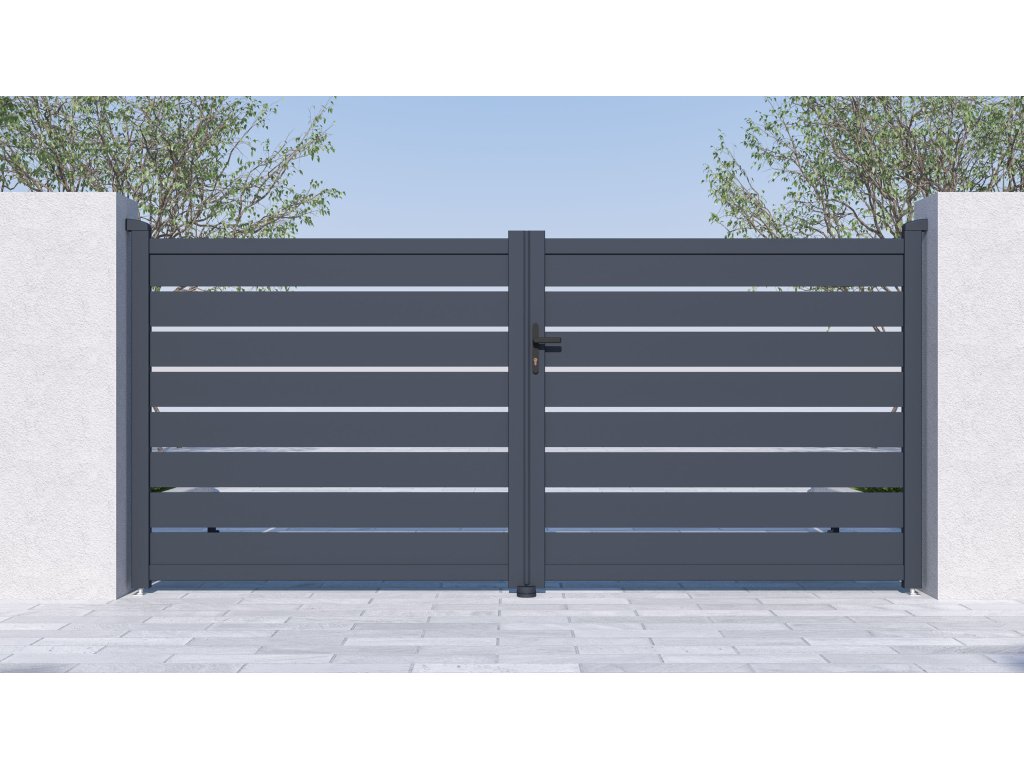 Výplň s horizontálně uloženými lamelami v atraktivním grafitovém provedení kombinuje dostatek soukromí s moderním designem, takže brána s otevíráním dovnitř bude slušet každému typu oplocené stavby.