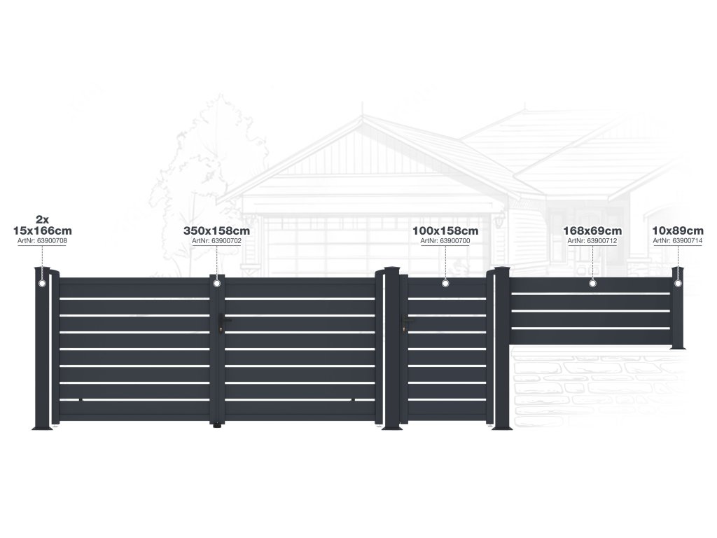 Vjezdová brána je důležitou součástí oplocení. 158 cm vysoká hliníková brána Reno má díky práškovému nástřiku ještě delší životnost, je odolná, atraktivní a její šířku můžete i přizpůsobit stávajícímu oplocení. Otevírání na kliku a zámek s FAB vložkou, šířka 350 cm umožní hladký průjezd všech vozidel.