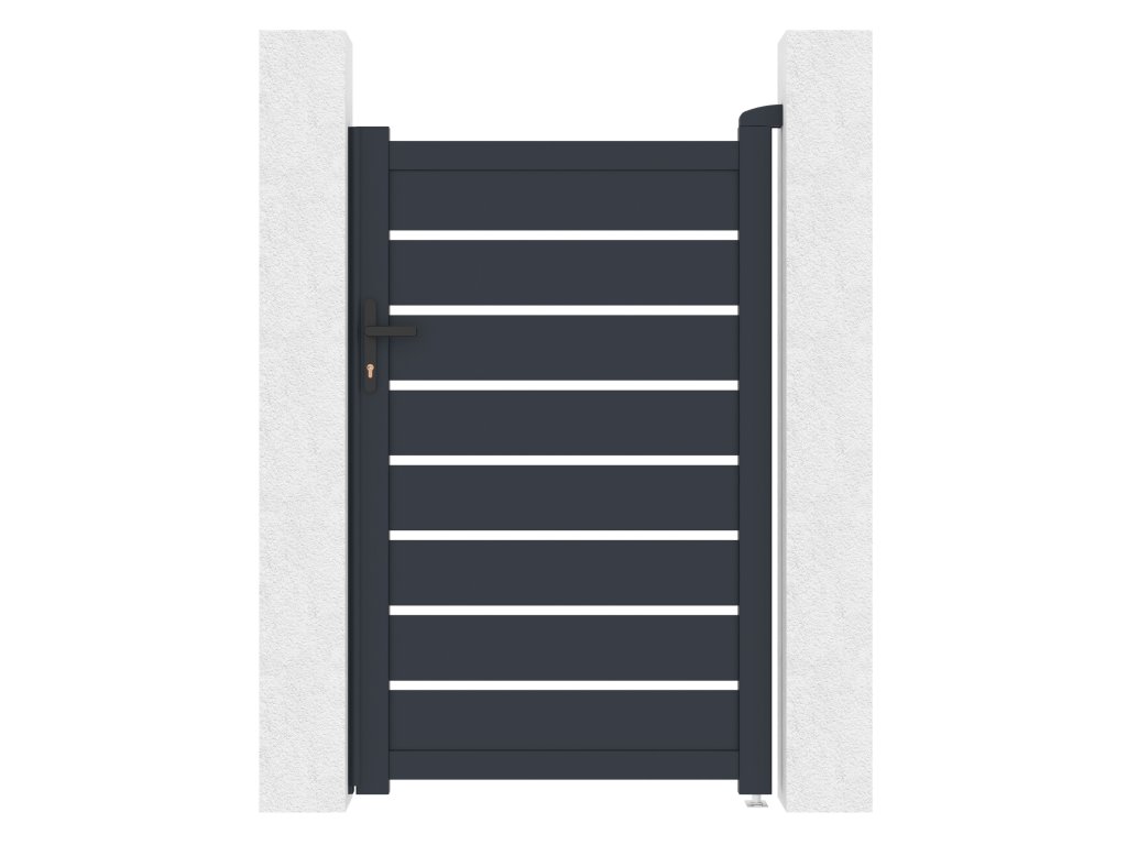 Výplň s horizontálně uloženými lamelami v atraktivním grafitovém provedení kombinuje dostatek soukromí s moderním designem, takže branka s otevíráním dovnitř bude slušet každému typu oplocené stavby.