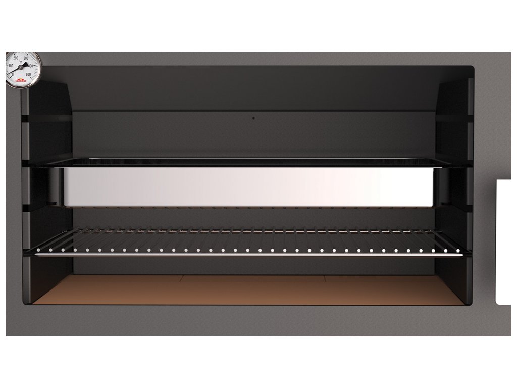Součásti je výškově stavitelný drátěný rošt a nerezový pečící plech o velikosti 595 x 377 mm.