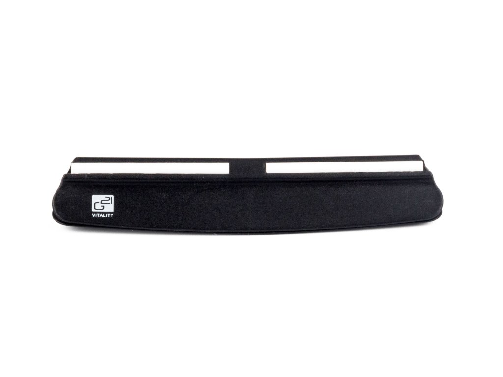 Brusný kámen z korundu je uložen v silikonovém bloku s výřezem na míru. V balení naleznete i šikovné vodítko s nastaveným úhlem broušení (15 °).