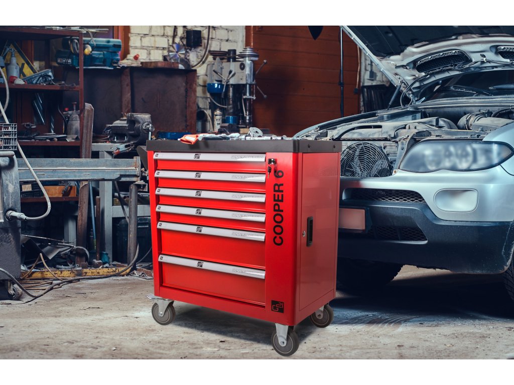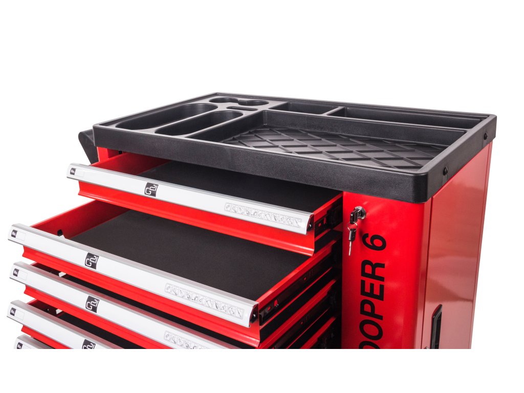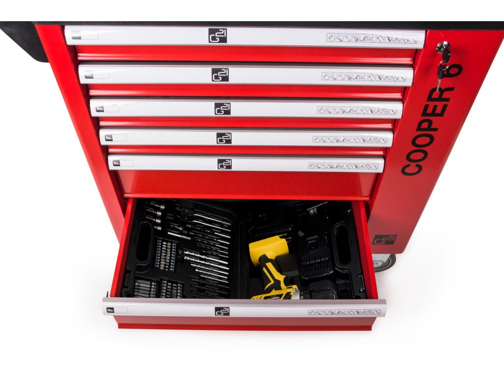 Dílenský vozík G21 Cooper 6 jsme zkonstruovali tak, aby pojal co největší množství dílenského nářadí a příslušenství. V šesti vnitřních zásuvkách a boční skříňce najdete místo pro uložení šroubováků i kleští, vrtaček nebo aku nářadí i příslušenství a dalšího nezbytného dílenského vybavení.