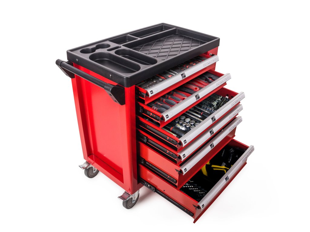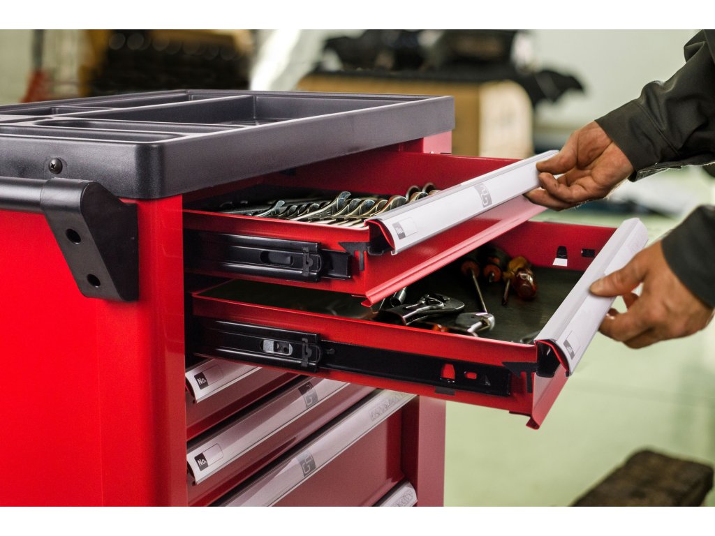 Díky promyšlenému řešení horní strany můžete mít na pracovní desce odložené věci, aniž by spadly při pohybu vozíku. V pracovní desce jsou zapuštěné přihrádky, ve kterých můžete mít uloženy nejčastěji používané nářadí, šrouby a díly, které potřebujete mít stále při ruce a podobně.
