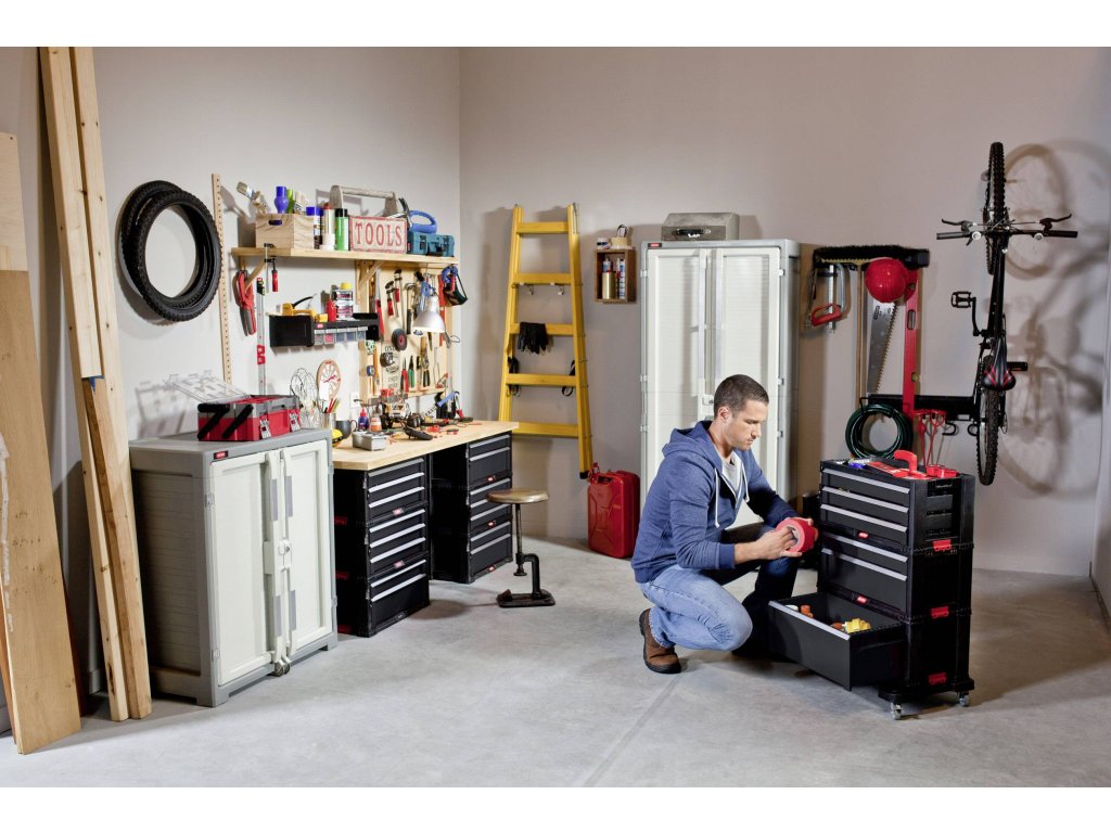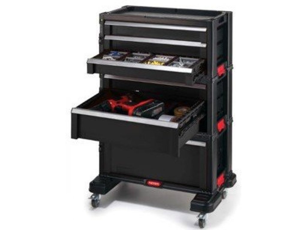 Dílenský vozík Keter s 6 zásuvkami nabízí úložný prostor pro velké množství nářadí, jako jsou šroubováky, kleště, vrtačky nebo aku nářadí a další nástroje a příslušenství. Je vyrobený z pevného a odolného plastu.