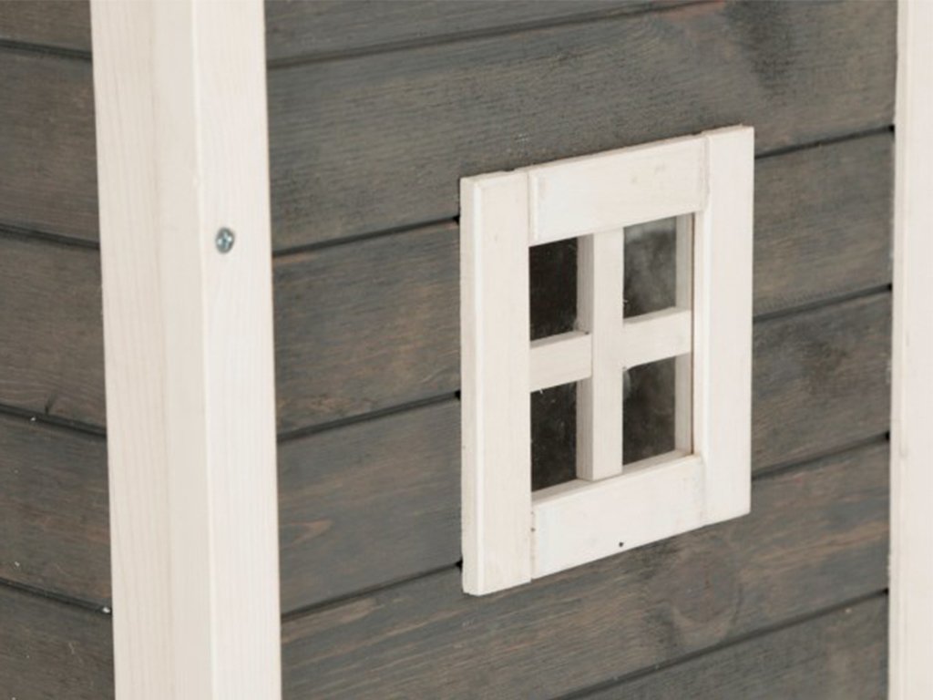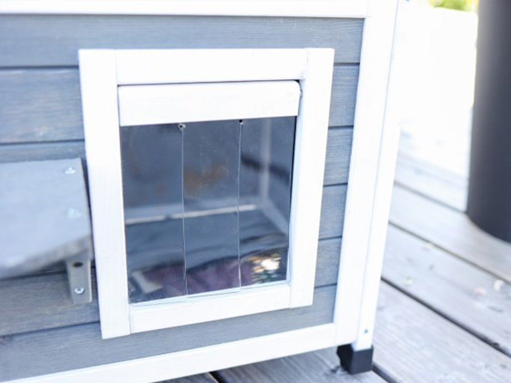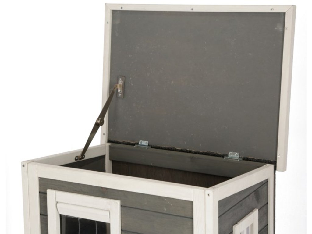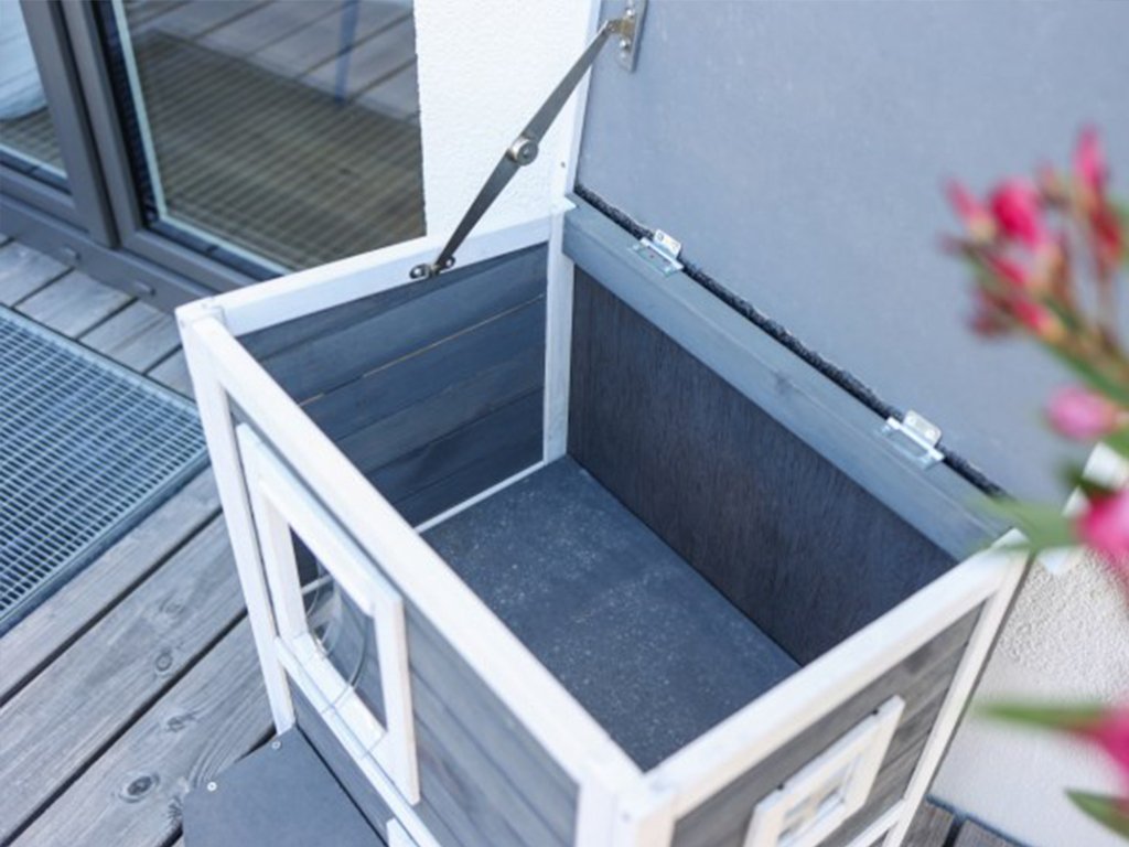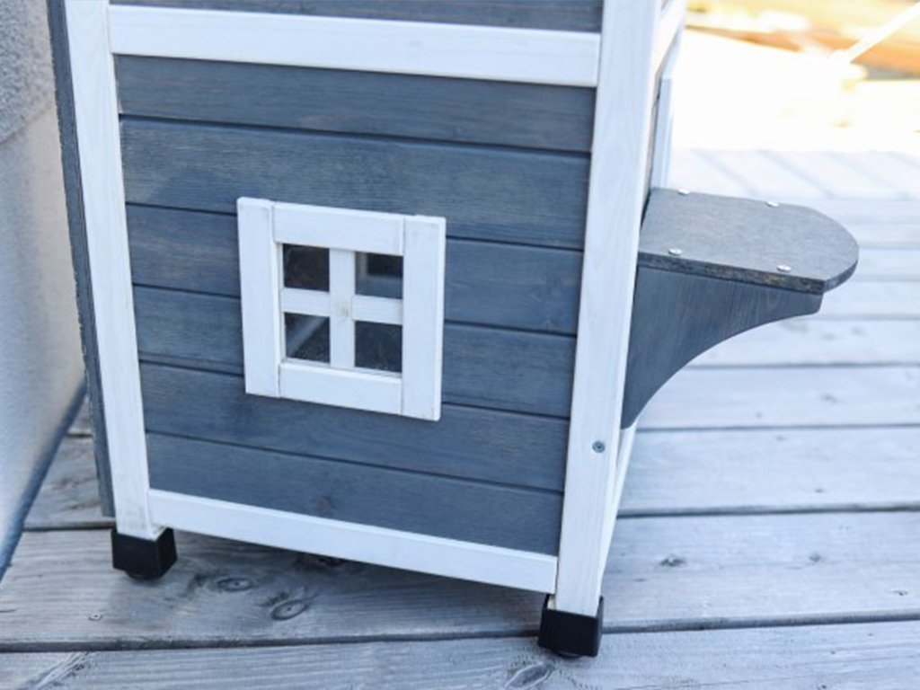 Domeček pro kočky má dvě neprůchozí patra. Vstup do druhého patra usnadňuje praktický schůdek. Každé patro je vybaveno malým okénkem vyplněným plexisklem, pro zajištění více světla v interiéru. Dvířka v obou patrech jsou opatřena výklopnými závěsy s průhlednými lamelami, které kočku chrání uvnitř boudy proti větru a chladu. V letním období je možné závěsy jednoduše odejmout. Bouda pro kočku má čtyři výškově nastavitelné plastové nožky. Lepší přístup do boudy zajišťuje odklápěcí střecha.