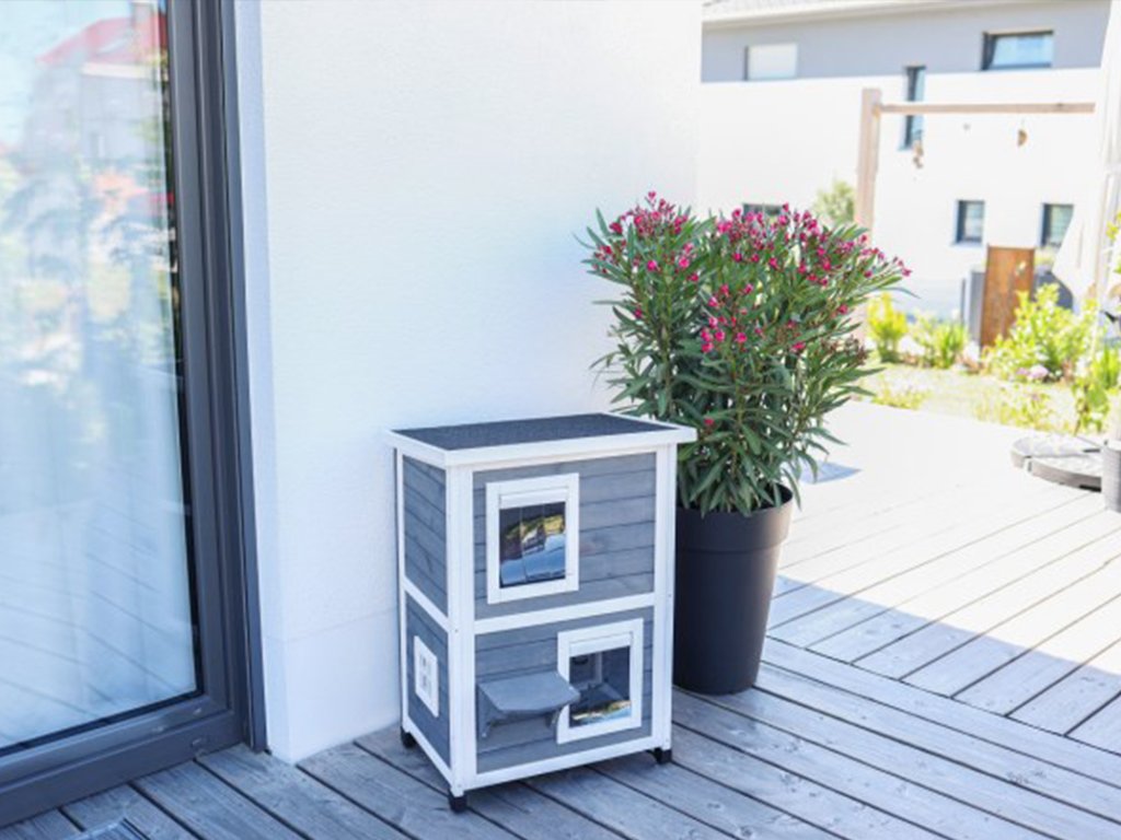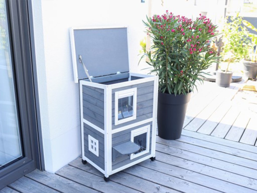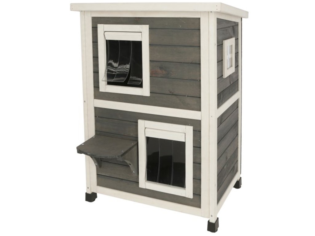 Dvoupatrová bouda pro kočku, dřevěná, okna z plexiskla, výškově nastavitelné plastové nožky, odklopné dvířka, rozměry: 57 x 55 x 80 cm. Pokud hledáte boudu pro dvě kočičky, která se bude krásně vyjímat na každé zahradě nebo na balkóně, máme pro vás skvělý tip. Tato bouda pro kočky s dvěma neprůchozími patry poskytne mazlíčkům příjemné bezpečné zázemí. Kočky budou mít v domku dostatek světla díky okénkům z plexiskla. Nemusí se bát ani větru a chladu, jelikož dvířka jsou chráněna průhlednými lamelami. Pro snadný přístup do vrchního patra je domek vybaven praktickým schůdkem.