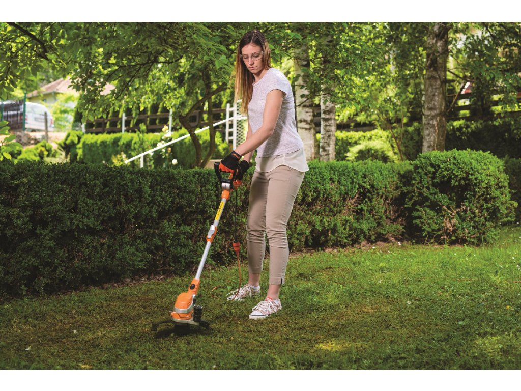 Díky hlavě motoru, kterou lze pro dosažení pohodlného sečení na svislých plochách otáčet o 180° a naklápět do tří poloh, je přístroj univerzálně využitelný. Jeho plynule posuvné teleskopické madlo z hliníku s nastavitelnou přídavnou rukojetí umožňuje pohodlné obouruční vedení a přesné přizpůsobení velikosti těla pro eliminaci únavy při práci. Kryt a přídavná rukojeť jsou vyrobeny z vysoce kvalitního, houževnatého plastu. Přívodní kabel vyžínače je chráněn před opotřebením a poškozením držákem kabelu pro odlehčení tahu, přídavný ochranný kryt chrání uživatele před zvířenými částicemi, jako jsou kameny nebo dřevěné třísky.