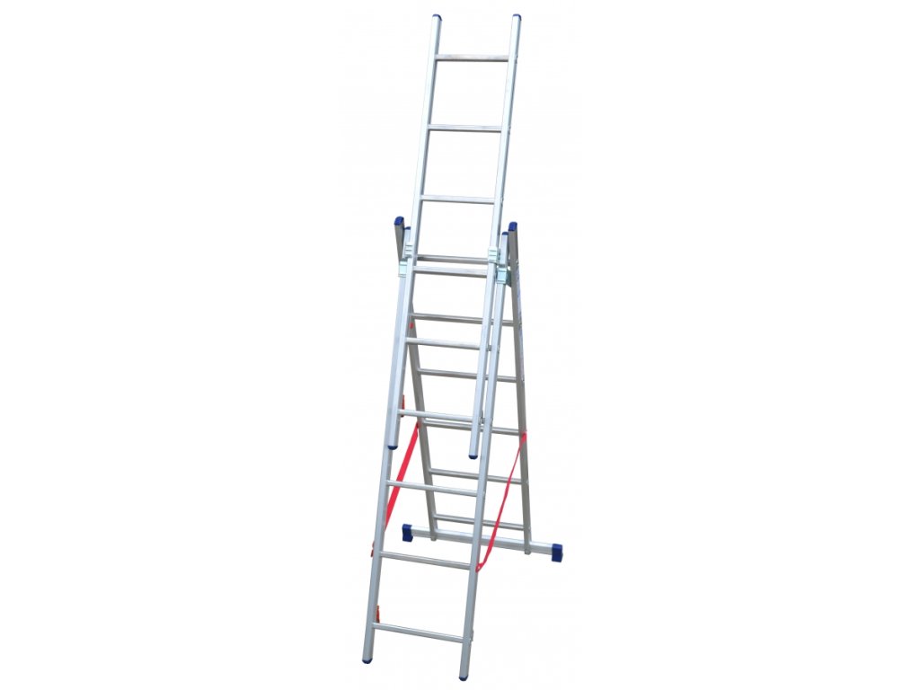Třídílný hliníkový žebřík lze použít jako výsuvný štaflový žebřík, štafle nebo opěrný žebřík. Tento typ žebříku je možno použít také na schody. Protiskluzové příčky mají rozměry 24×24 mm.