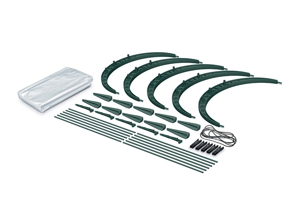 Nízký fóliovník pro domácí i polní pěstování, průhledná fólie s hliníkovými očky pro upevnění k zemi, ochrana rostlin před deštěm a větrem, barva zelená.