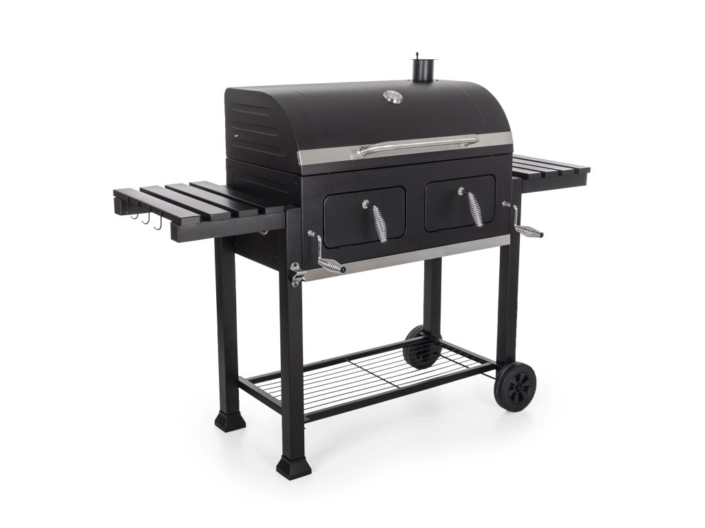 Poctivý gril se dvěma topeništi s regulací výšky, vestavěným teploměrem, odkládacími plochami a pojezdem.