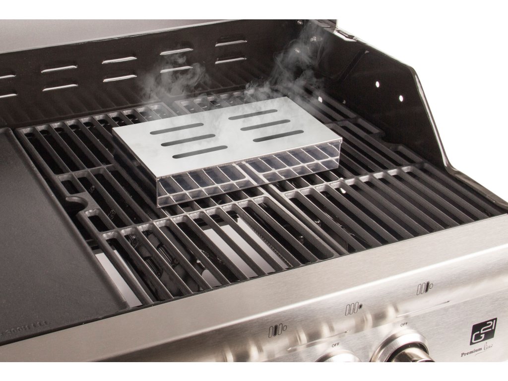Po zavření víka grilu a zahřátí grilu se z namočených dřevěných lupínků začne uvolňovat kouř, který naplní grilovací prostor a grilované maso, ryby nebo další speciality získají jedinečné kouřové aroma. G21 box na uzení se skvěle hodí i pro douzování sýrů, ovoce a zeleniny na grilu.