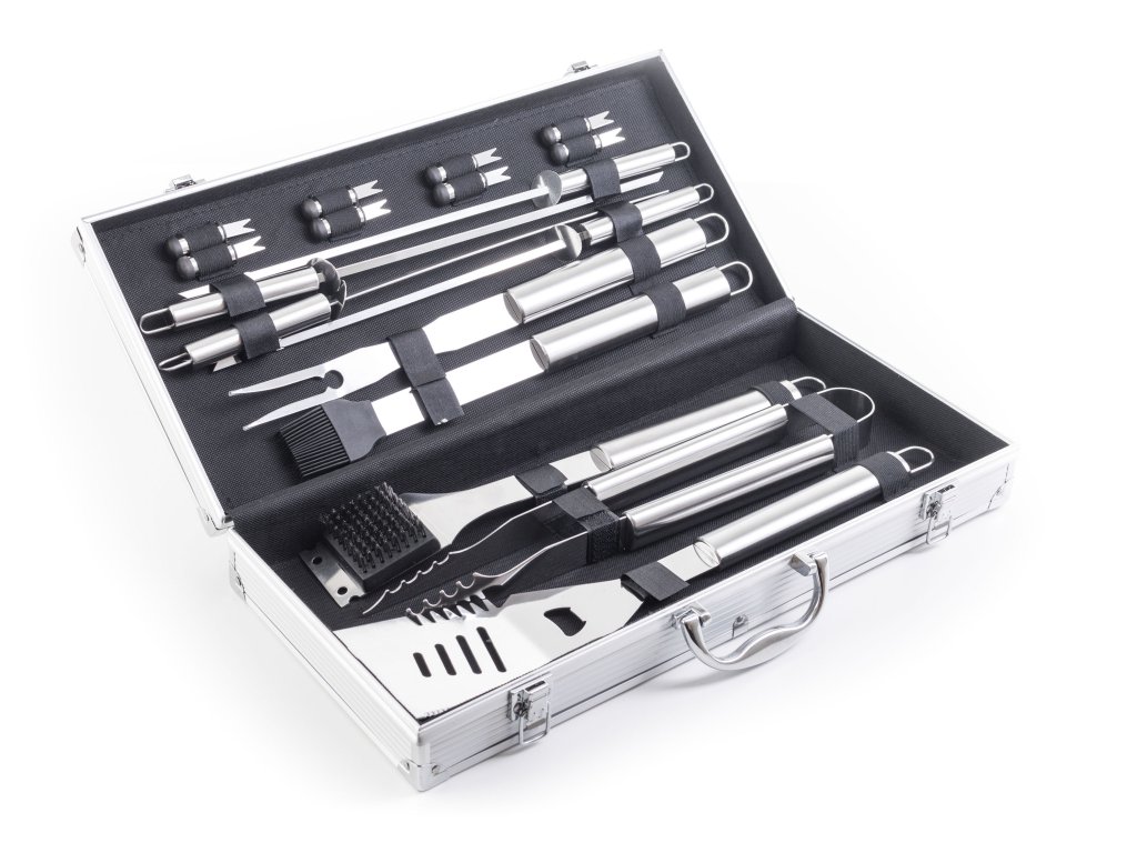 Sada obsahuje kompletní nástroje pro grilování bez potíží. Součástí sady je obracečka, vidlička, kleště, štětec na potírání, čistící kartáč, napichovátka pro snadné jedení klasů kukuřice a grilovací jehlice pro výrobu špízů. Délka nářadí 40 cm zajišťuje, že na vás při grilování nebudou šlehat plameny ani prskat olej z masa. Pro snadné přenášení a skladování je nářadí uloženo do praktického hliníkového kufru.