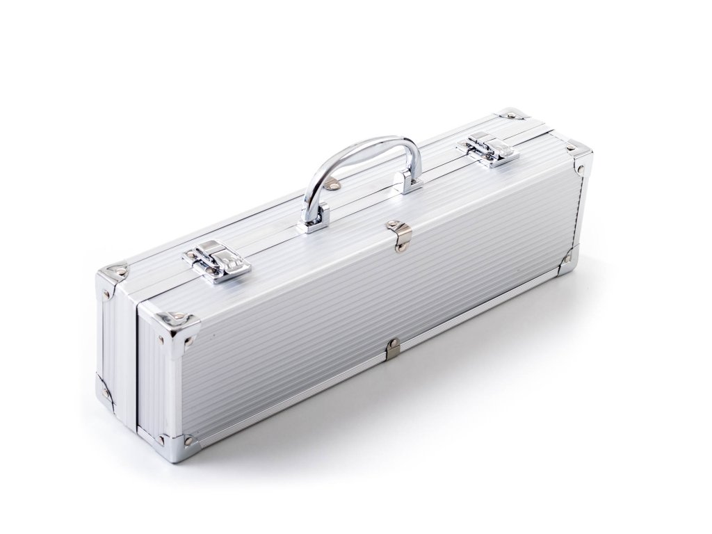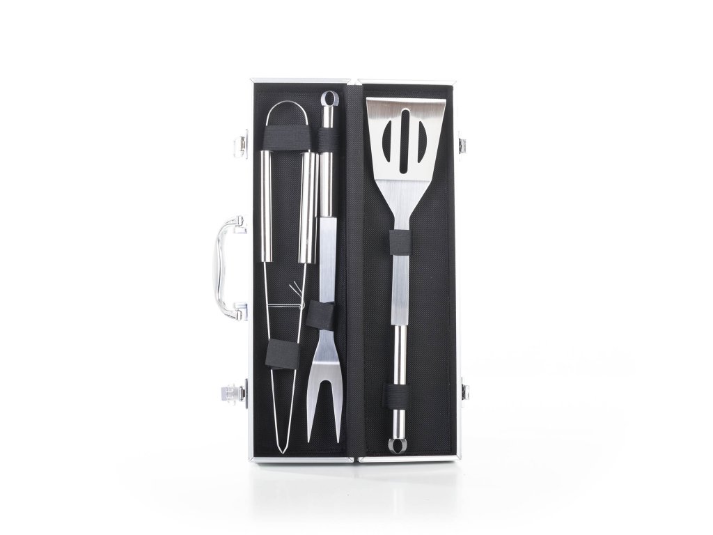 Sada obsahuje kompletní nástroje pro grilování bez potíží. Součástí sady je obracečka, vidlička a kleště o délce 34 cm. Pro snadné přenášení a skladování je nářadí uloženo do praktického hliníkového kufru.