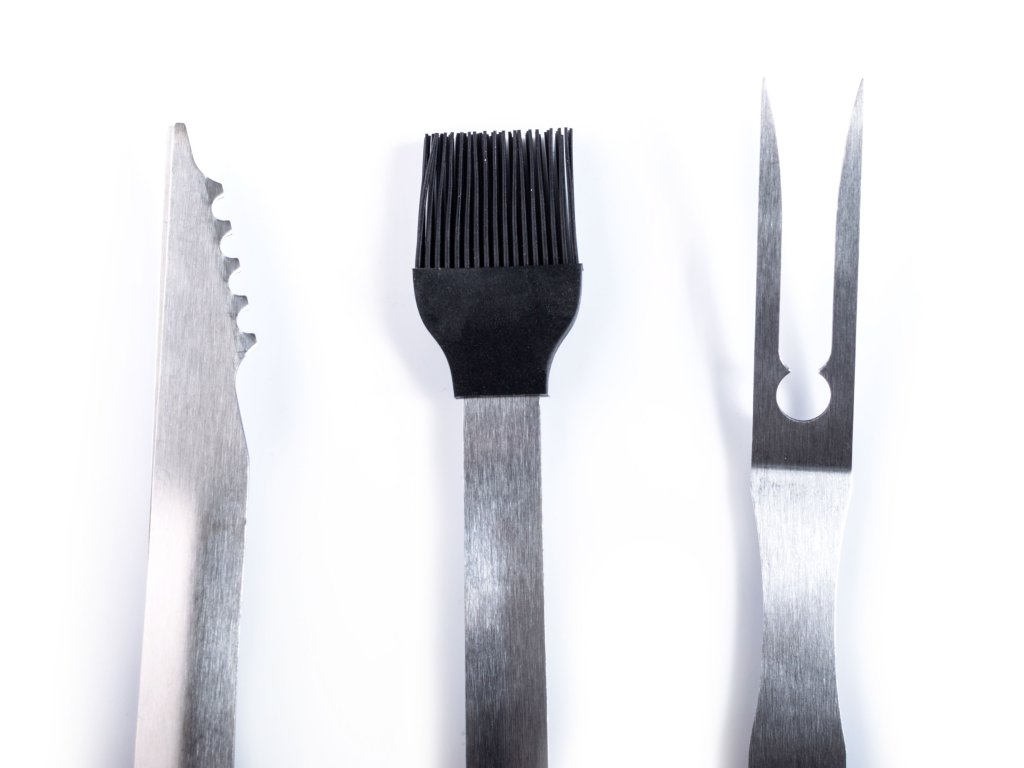 Nerezové grilovací nářadí G21 se 3 kusy v sadě obsahuje marinovací štětec, grilovací vidličku a grilovací kleště. Délka nářadí je 41 a 45 cm.
