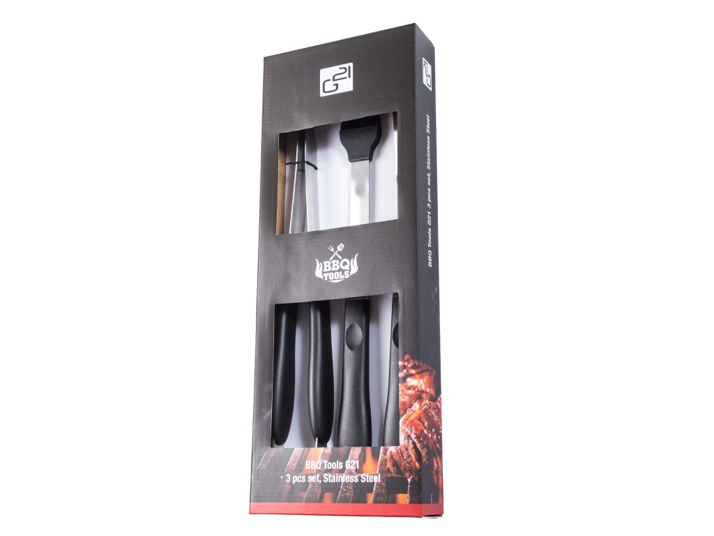 Praktické omyvatelné rukojeti z odolného plastu jsou přizpůsobeny pro pohodlné držení a díky očku na zavěšení je můžete odkládat na grilovací háčky G21. Grilovací kleště (45 cm) a grilovací vidlička (41 cm) jsou z nerezu, štětec na marinování (41 cm) je ze žáruvzdorného silikonu.