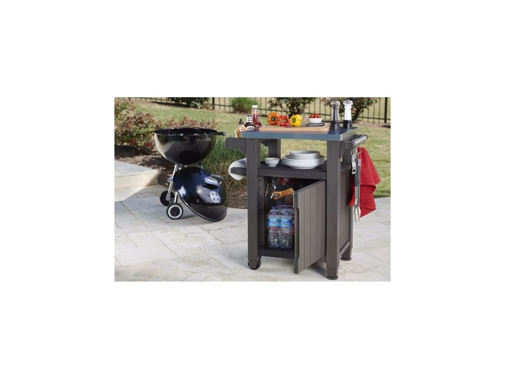 Hnědý grilovací stolek Unity značky Keter má kapacitu 105 litrů. Nerezová pracovní deska, praktická rukojeť s háčky na pověšení utěrek a kolečka pro přemisťování stolku dohromady vytvářejí dokonalé prostředí pro venkovní grilování.