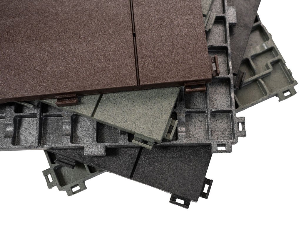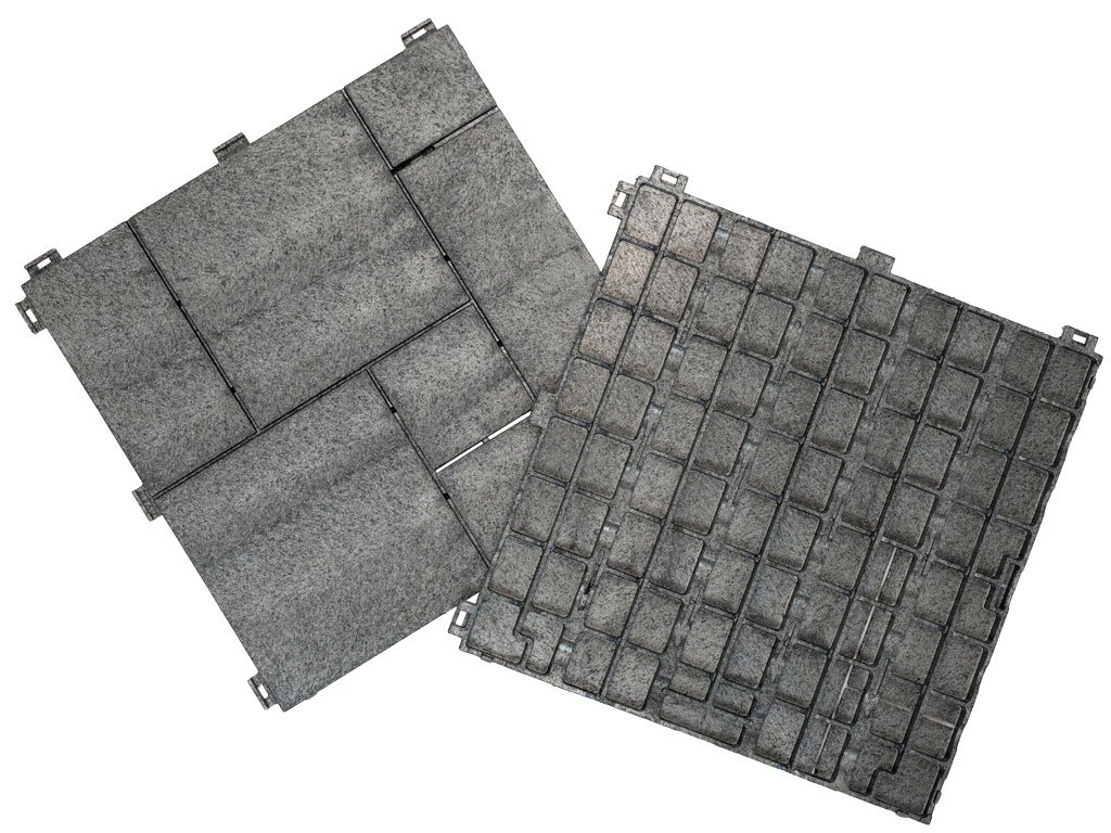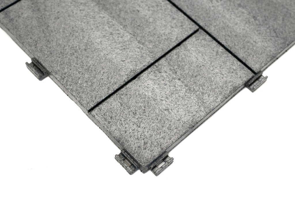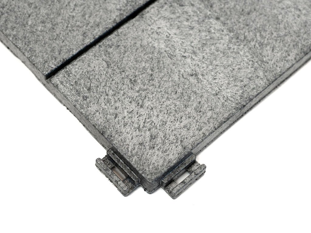 Gumová dlaždice 30 x 30 cm, výška 1,5 cm, v šedé barvě. Směs gumové pryže a polypropylenu s dlouhou životností a vysokou odolností. Velmi snadná montáž.