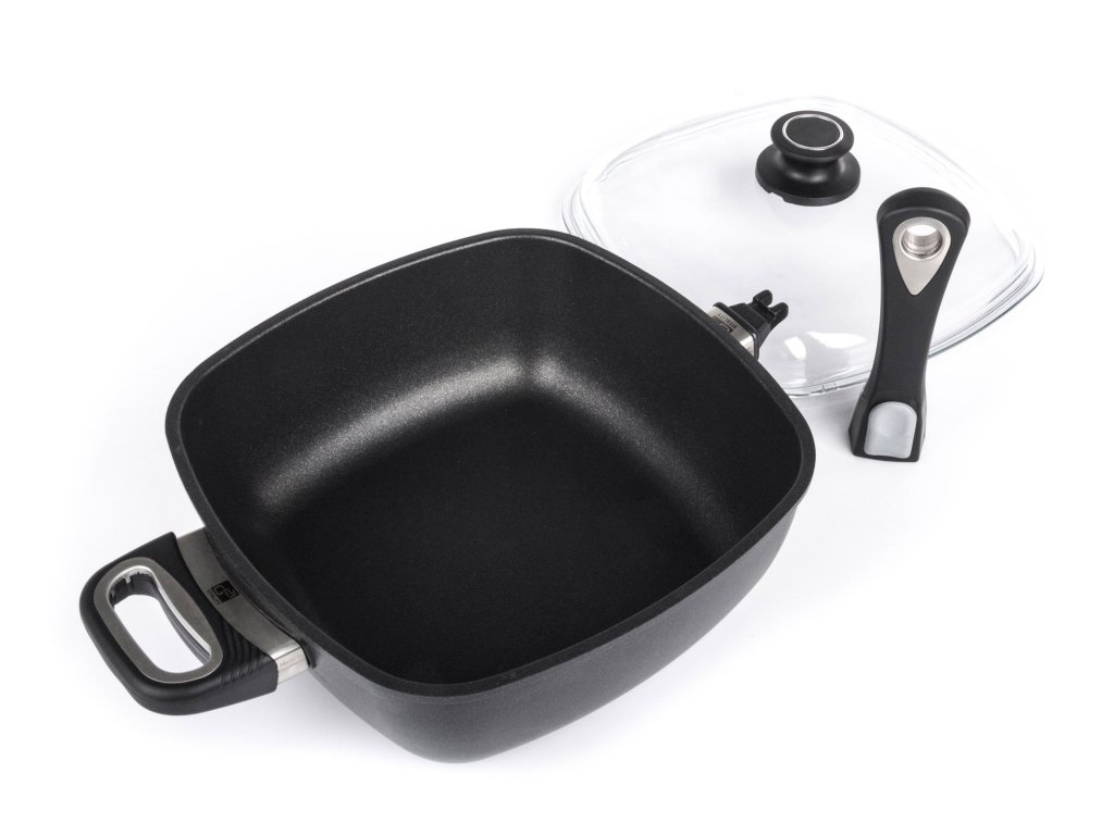 Prohlédněte si čtvercovou, 9 cm vysokou pánev, která splňuje všechny uvedené požadavky na dokonalou pánev. Je univerzální pro všechny typy ohřevů, teplo vede dokonale rovnoměrně, jídlo se na ní díky speciální nepřilnavé vrstvě LOTAN® nepřipaluje a smažit či zapékat můžete bez použití oleje.