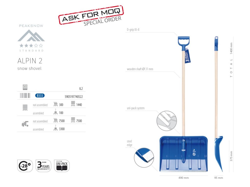 Hrablo z kvalitního plastu, dřeva a kovu, hliníková hrana pro snazší nabírání sněhu, odolnost vůči teplotám do -28 °C. Dřevěná násada pro pohodlný a bezpečný úchop. Modrá barva.