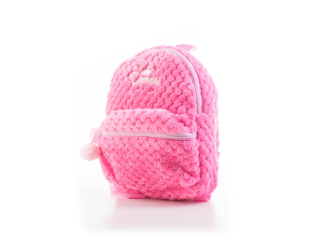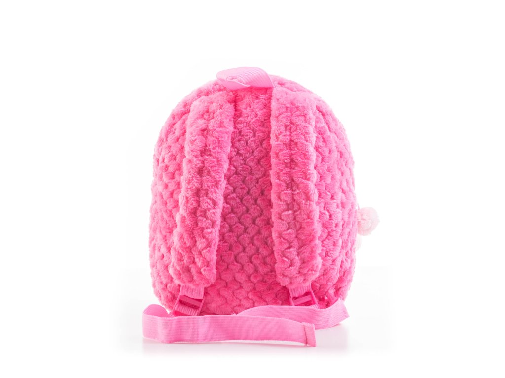 Batůžek má kromě hlavní velké kapsy také malou přední kapsičku, do které si mohou děti uložit všechny své malé poklady. Na zipech obou kapes jsou zavěšeny roztomilé chlupaté bambulky ve světle růžové barvě.