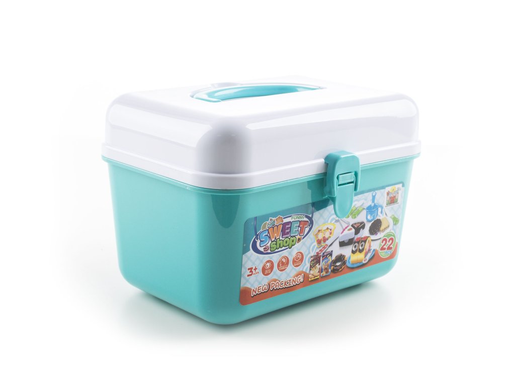 Krásný modrý plastový kufřík obsahuje kopii krámku s dortíky a