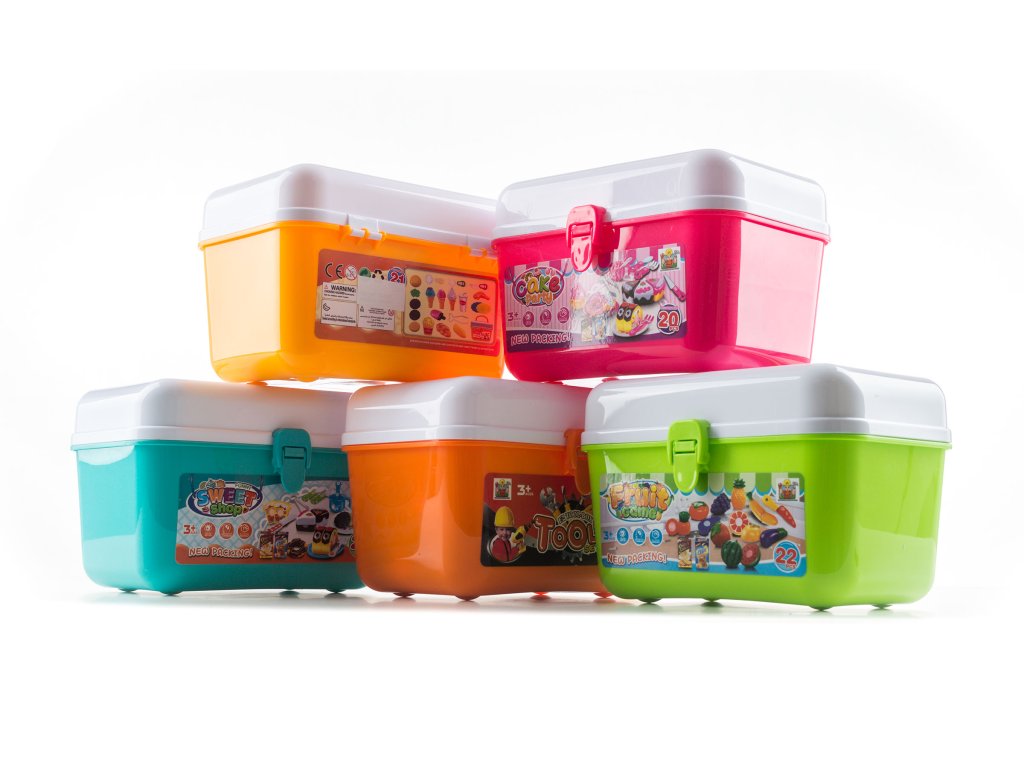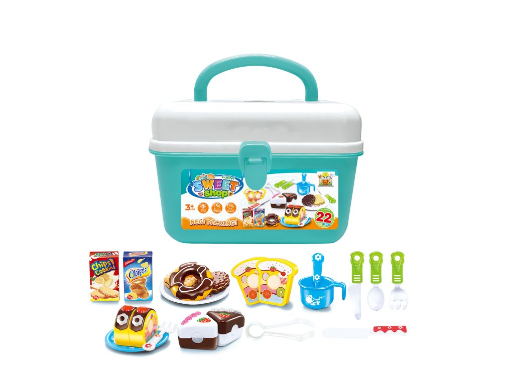 V kufříku najdete krásné barevné plastové dortíky, donuty, rolády, krabičky s ingrediencemi, nádobí i příbory. Zkrátka vše, co je v cukrárně potřeba. Součástí kufříku je také držadlo, díky kterému může mít vaše ratolest svůj krámek s dortíky u sebe i na cestách.