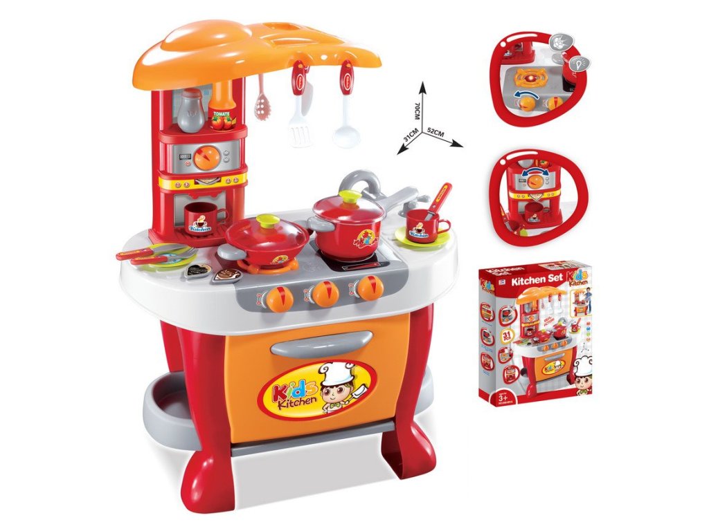 Dětská kuchyňka G21 v oranžové barvě má troubu, dvě plotýnky na vaření, dřez, odkládací plochu, věšák na kuchyňské náčiní a mnoho dalšího příslušenství. Zvuk a světelná signalizace při zapnutí plotýnky. V balení 31 kusů nádobí jiného příslušenství.