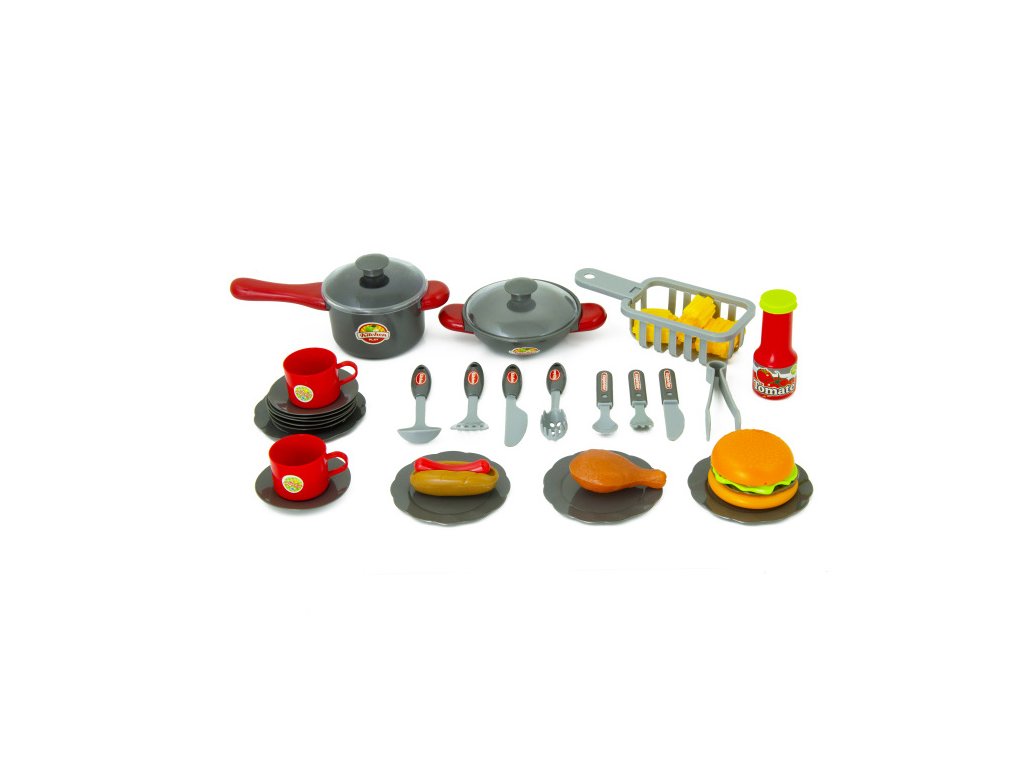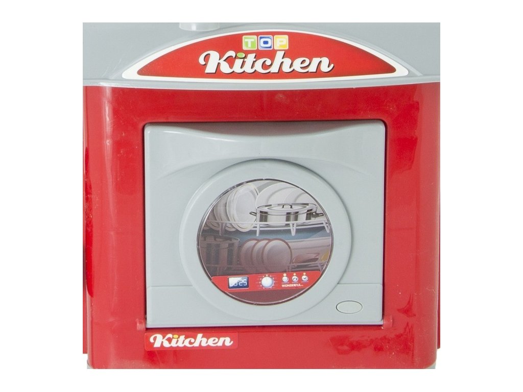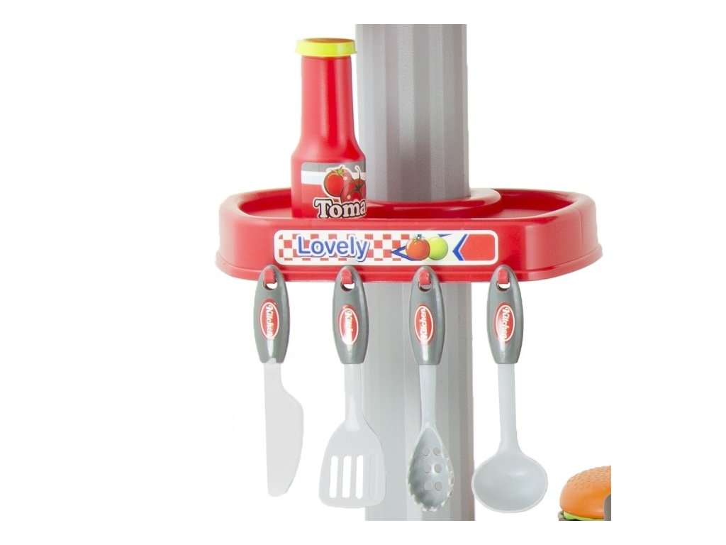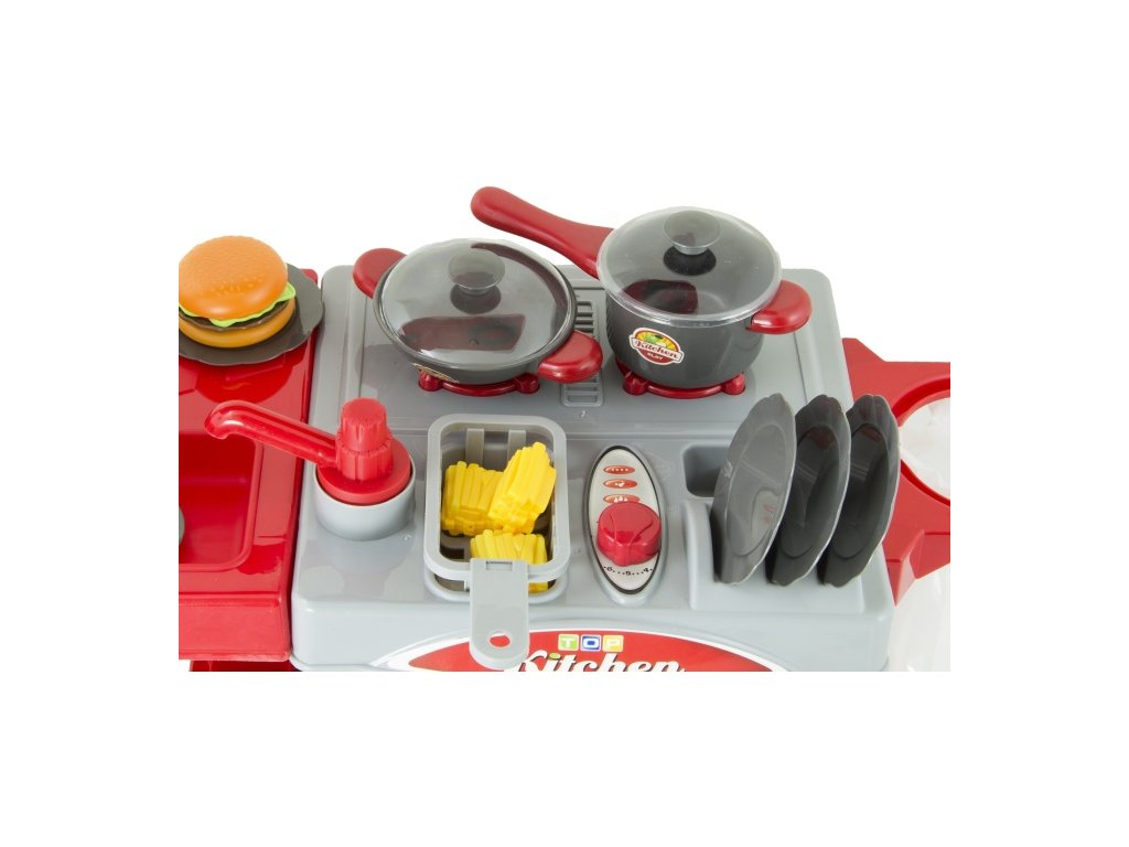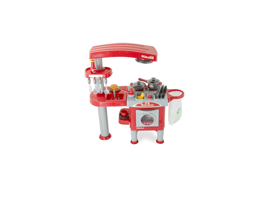 Dětská červená kuchyňka G21 je vybavena spotřebiči, nádobím a jídlem. Vše z plastu. Malí kuchtíci budou vařit, péct, fritovat, mýt nádobí, zbytky dávat do koše a umyté nádobí uklízet. Spotřebiče nevydávají žádný zvuk. Vhodné pro děti od 3 let.