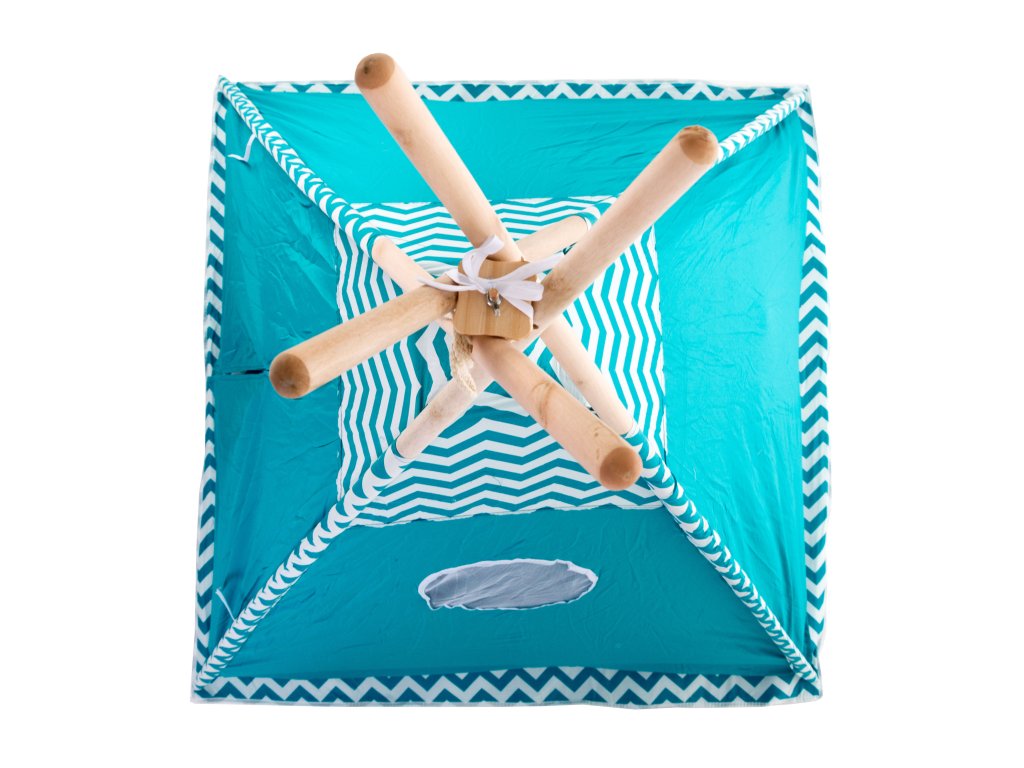 Ani na ten jsme samozřejmě nezapomněli! Nejen že je součástí teepee rovnou i podlážka, což není běžně zvykem, ale navíc dostanete k teepee i vybavení v podobě dvou polštářků. Na ty si mohou děti buď sednout, nebo na ně složit hlavu při odpoledním odpočinku. Na jedné stěně teepee je umístěno okénko.