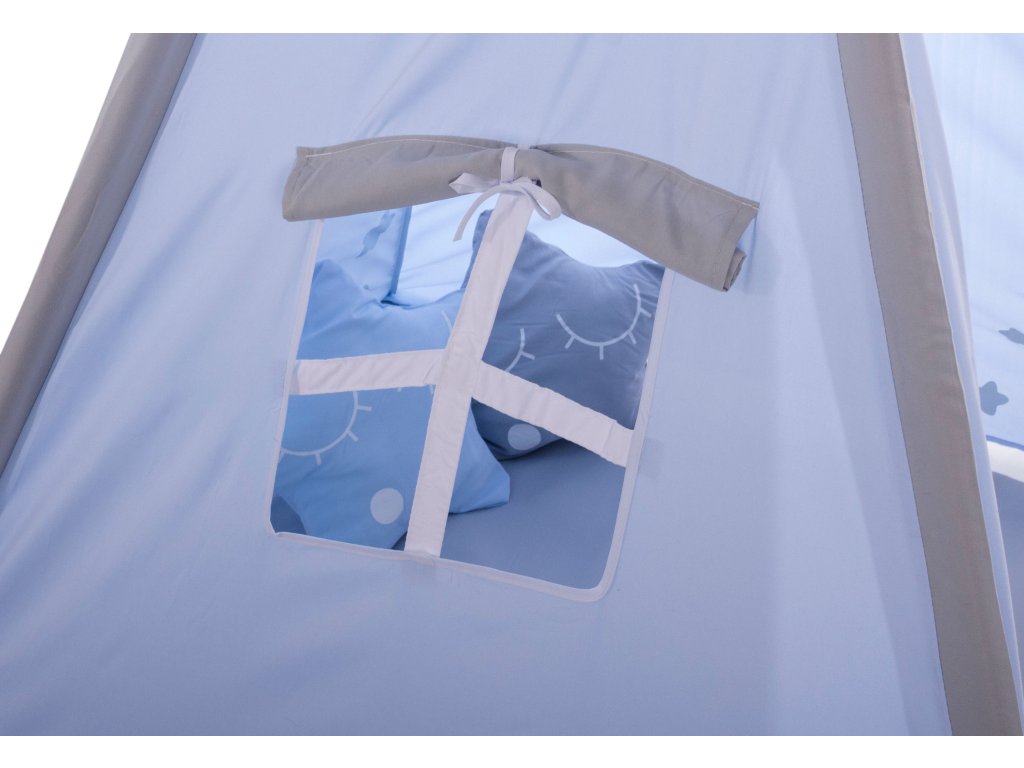 Ani na ten jsme samozřejmě nezapomněli! Nejen že je součástí teepee rovnou i podlážka, což není běžně zvykem, ale navíc dostanete k teepee i vybavení v podobě dvou polštářků. Na ty si mohou děti buď sednout, nebo na ně složit hlavu při odpoledním odpočinku. Na jedné stěně teepee je umístěno okénko.