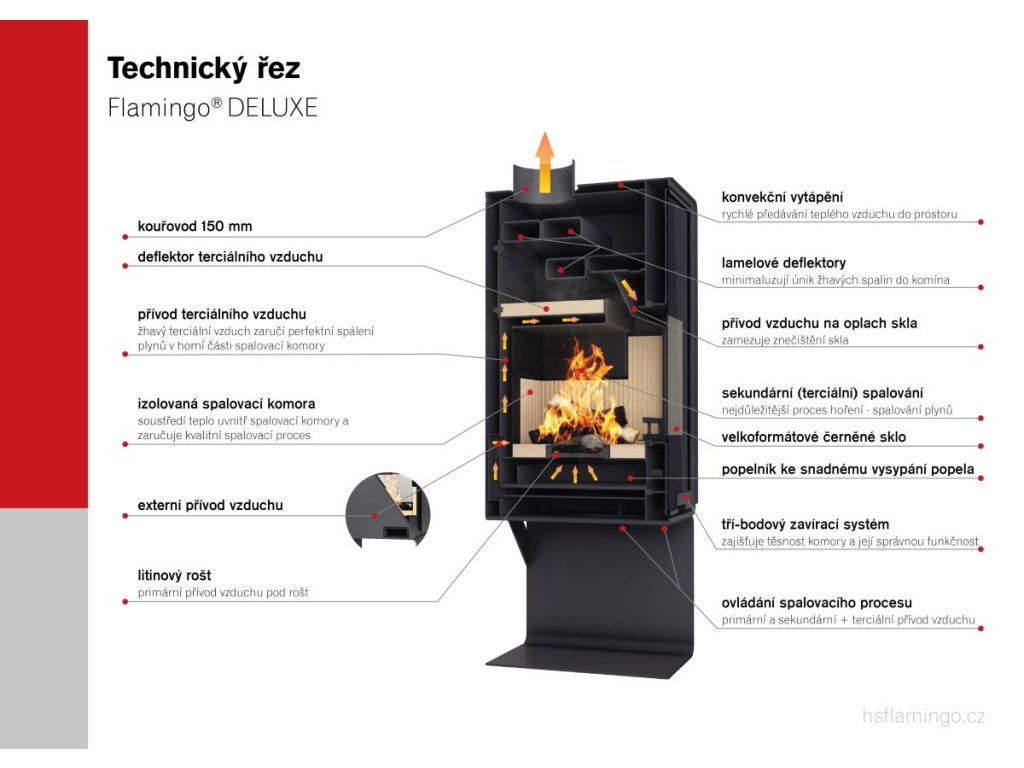 Systém spalování u kamen Flamingo DELUXE je dokonalost sama. Přísun vzduchu je zajištěn centrálně ze zadní části kamen. Množství popela je minimální. Celý spalovací proces je ovládán dvěma táhly, kdy první slouží k regulaci primárního vzduchu, potřebného k zatopení a rozhoření dřeva. Druhé táhlo slouží k podpoře sekundárního spalování, tedy spalování plynů. Jeho otevřením dochází k přísunu terciálního předehřátého vzduchu do horní části, který je vháněn do komory pomocí vrchního deflektoru. Tento vzduch se používá k úspornému a co nejefektivnějšímu průběhu hoření dřeva. Tímto je zajištěna vysoká účinnost a krásné hoření včetně čistého skla. K zajištění správného spalování je zapotřebí správný tah komína, který docílíte umístěním regulátoru na kouřovod nebo komínovou branku.