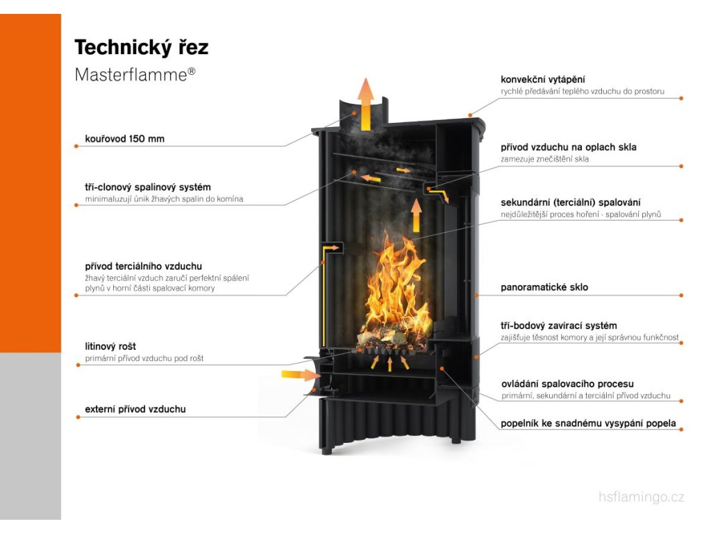 Krbová kamna MASTERFLAMME MEDIE využívají inteligentní přívod primárního, sekundárního i terciárního vzduchu. Tento systém zajišťuje: