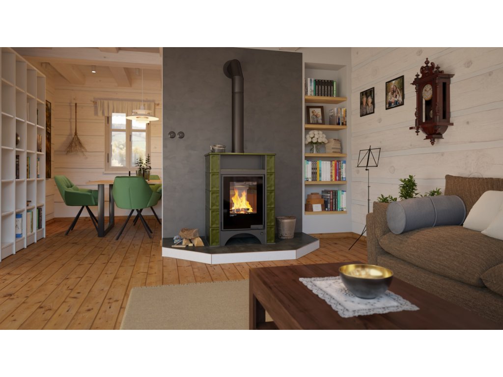 - obložena pravými, ručně vyráběnými kachlemi. Kachle jsou akumulačním materiálem a z toho důvodu se akumulační schopnost kamen značně navyšuje.