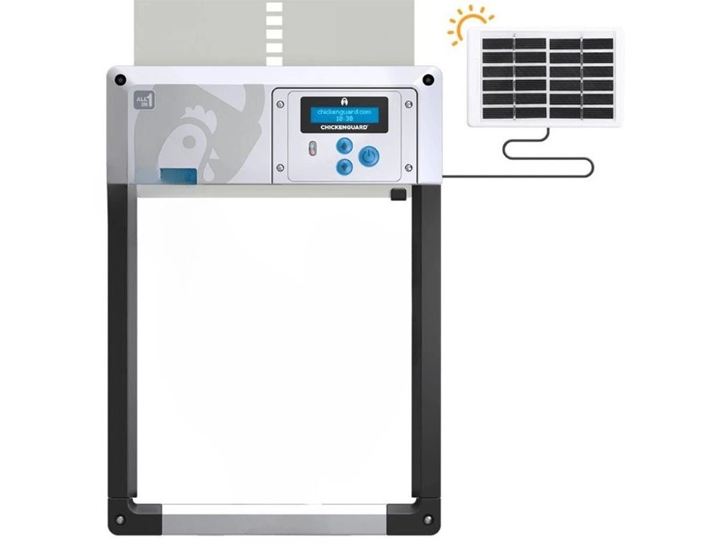 Chicken Guard ALL IN ONE SOLAR má extra výkonný motor, který dokáže zvednout až 2 kg. Součástí zařízení je také bezkontaktní snímač polohy dvířek. Přístroj je vybaven velice odolným pouzdrem, a tak zajišťuje perfektní ochranu při extrémních povětrnostních podmínkách až do teploty -20°C. Všechny potřebné informace o nastavení a stavu baterie jsou znázorněny na přehledném LCD displeji.
