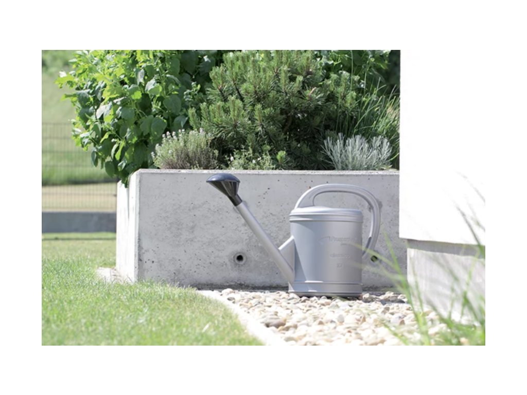 Stylová plastová zahradní konev, stříbrná barva. Kropící nástavec pro lepší rozptyl. Rozměry 35 x 23 x 50 cm, objem 10 l.