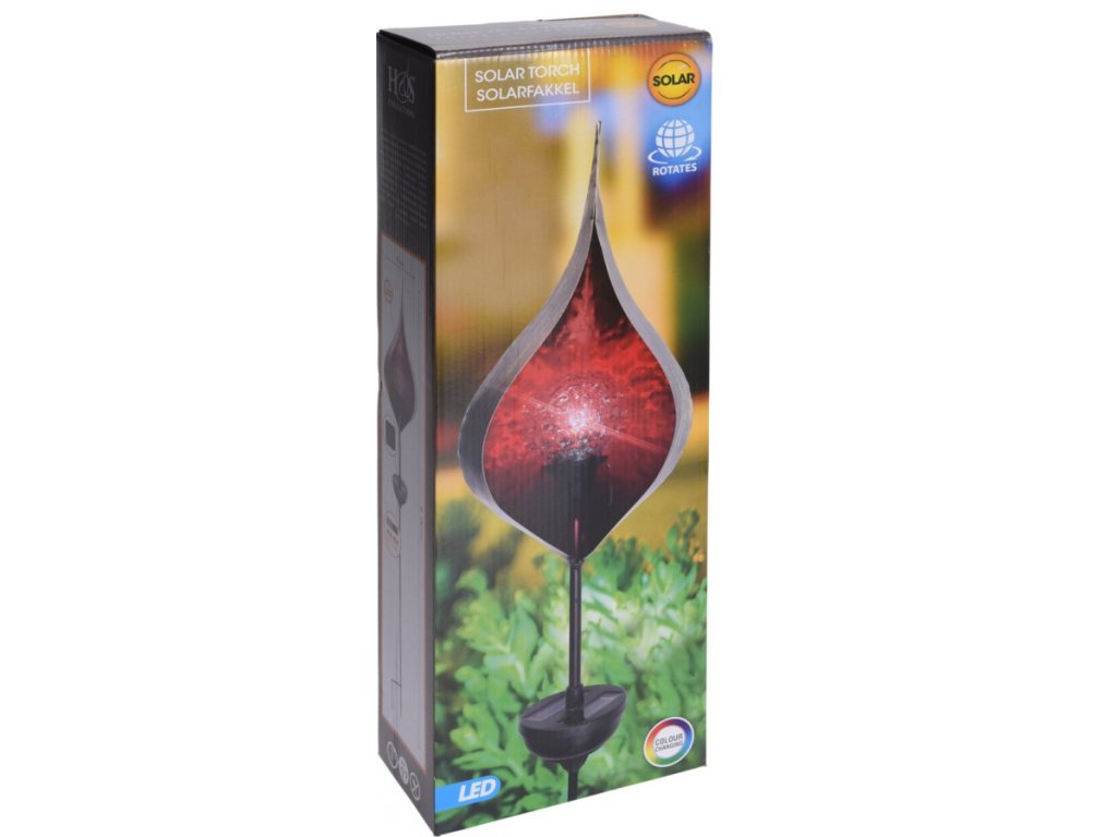 Solární lampa se skládá ze zemního hrotu na kterém je integrovaný nabíjecí článek, na vrcholu je je lampa ve tvaru pochodně, lampa po nabití svítí a rotuje až 6 h, světlo vytváří třpytivý světelný efekt.