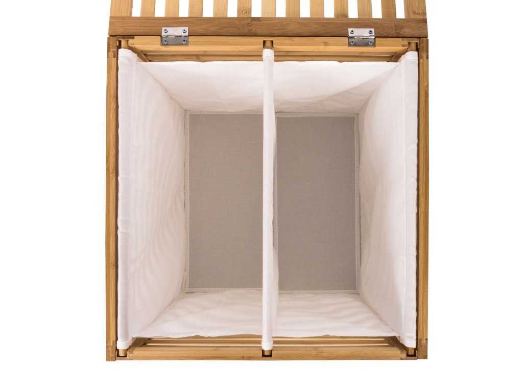 Bambusový koš G21 s pevným víkem má pratelnou látkovou vložku, rozdělenou na dva samostatné oddíly. Špinavé prádlo tak můžete třídit už před praním a umístit zvlášť kousky podle materiálu nebo barvy.