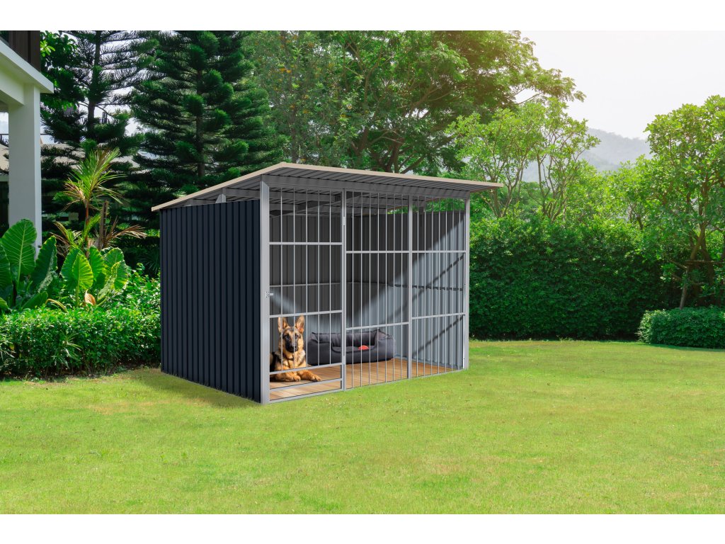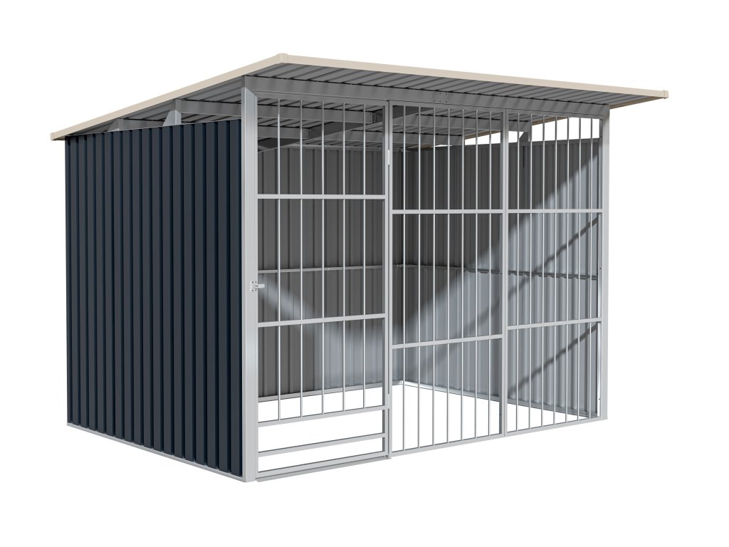 Kotec pro psa G21 o velikosti 260 x 220 cm je prostorný a bytelný, se třemi pevnými stěnami a vyspádovanou střechou. Psí kotec G21 má velké dveře pro snadný přístup i západku na jejich zajištění.