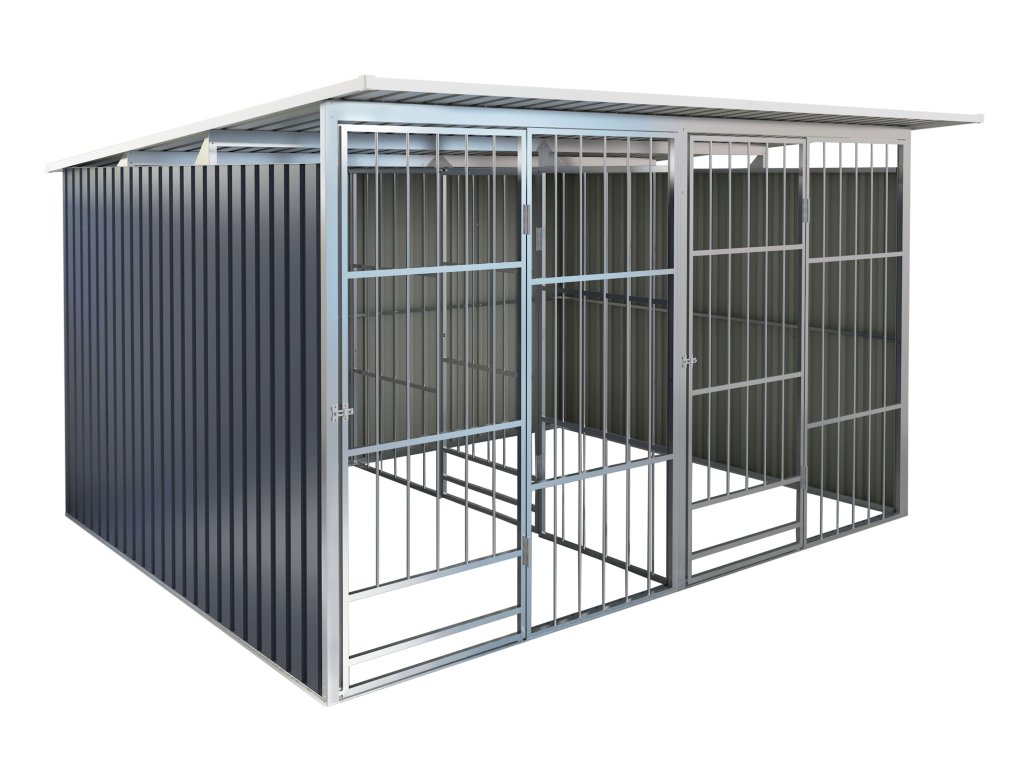 G21 Kotec pro dva psy o velikosti 322 x 275 cm je prostorný a bytelný, se třemi pevnými stěnami, dělicí příčkou a vyspádovanou střechou. Psí kotec G21 má dvoje dveře pro snadný přístup i západky na jejich zajištění.