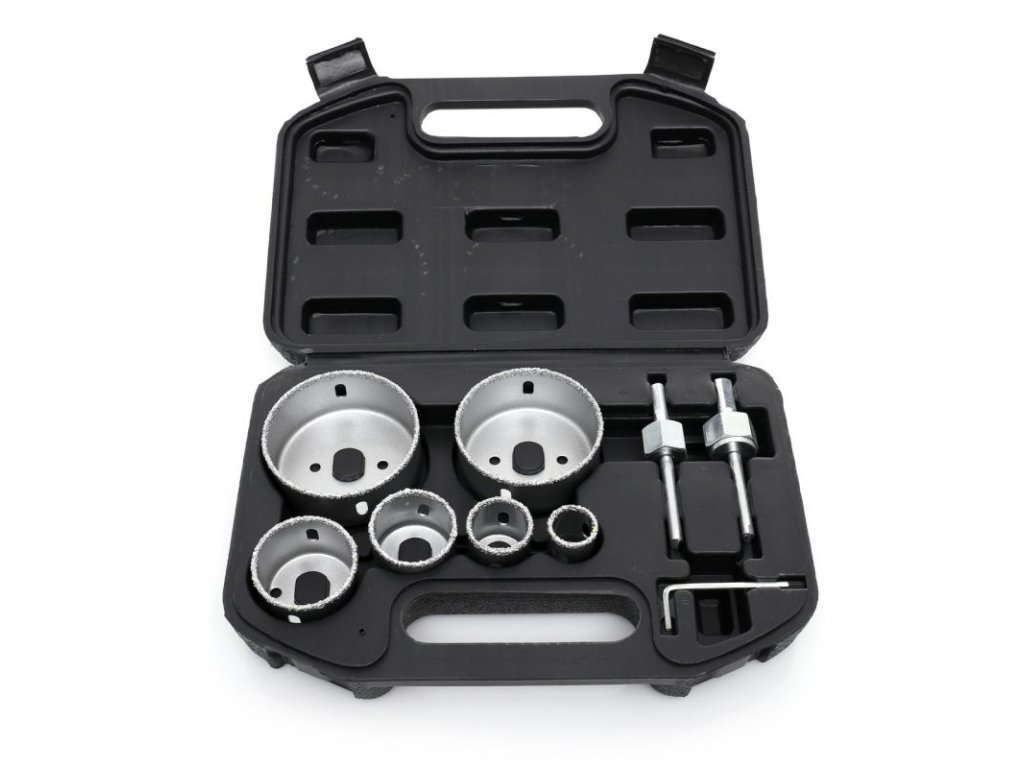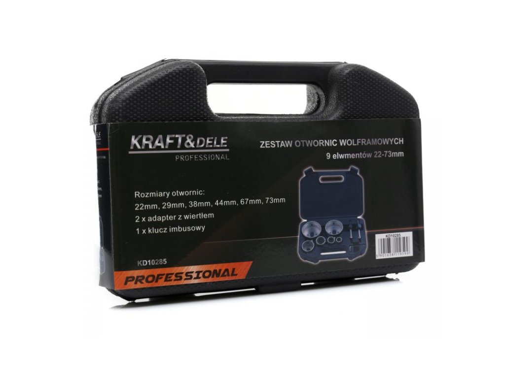 Profesionální sada wolframových vrtacích korunek značky Kraft&Dele, model KD10285, je určena pro domácí uživatele, dílny i průmyslové provozy. Sada obsahuje 6 vrtacích korunek o velikostech: 22, 29, 38, 44, 67, 73 mm, imbusový klíč a dva adaptéry s vrtákem. Korunky jsou vhodné pro přesné vytváření otvorů v tvrdých materiálech jako jsou glazury, terakota či sádrokarton.