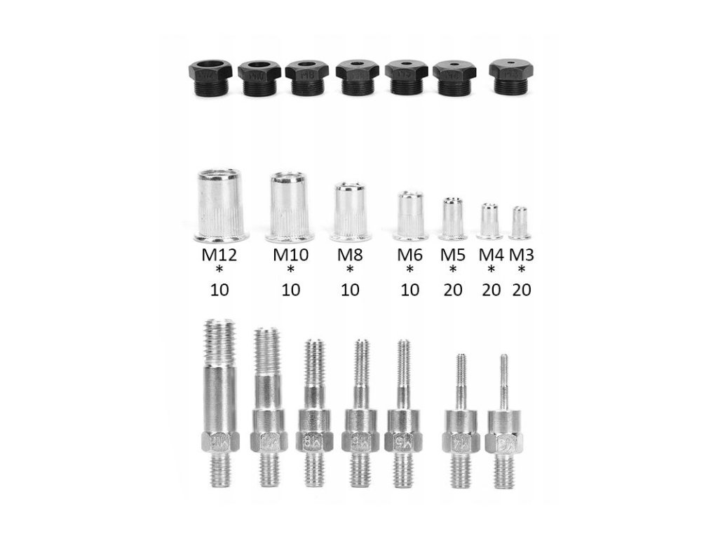 - nýty: M3 (20 ks), M4 (20 ks), M5 (20 ks), M6 (10 ks), M8 (10 ks), M10 (10 ks) a M12 (10 ks)