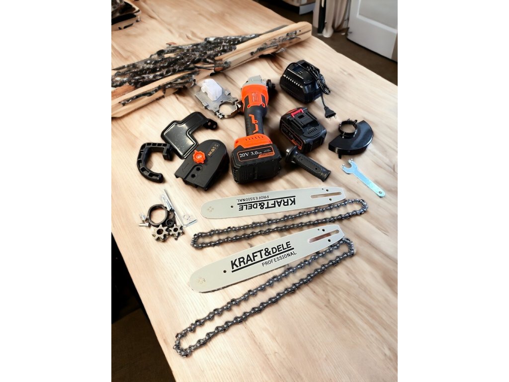 Profesionální akumulátorové nářadí 2 v 1 od společnosti Kraft&Dele se skládá z brusky a pilového adaptéru