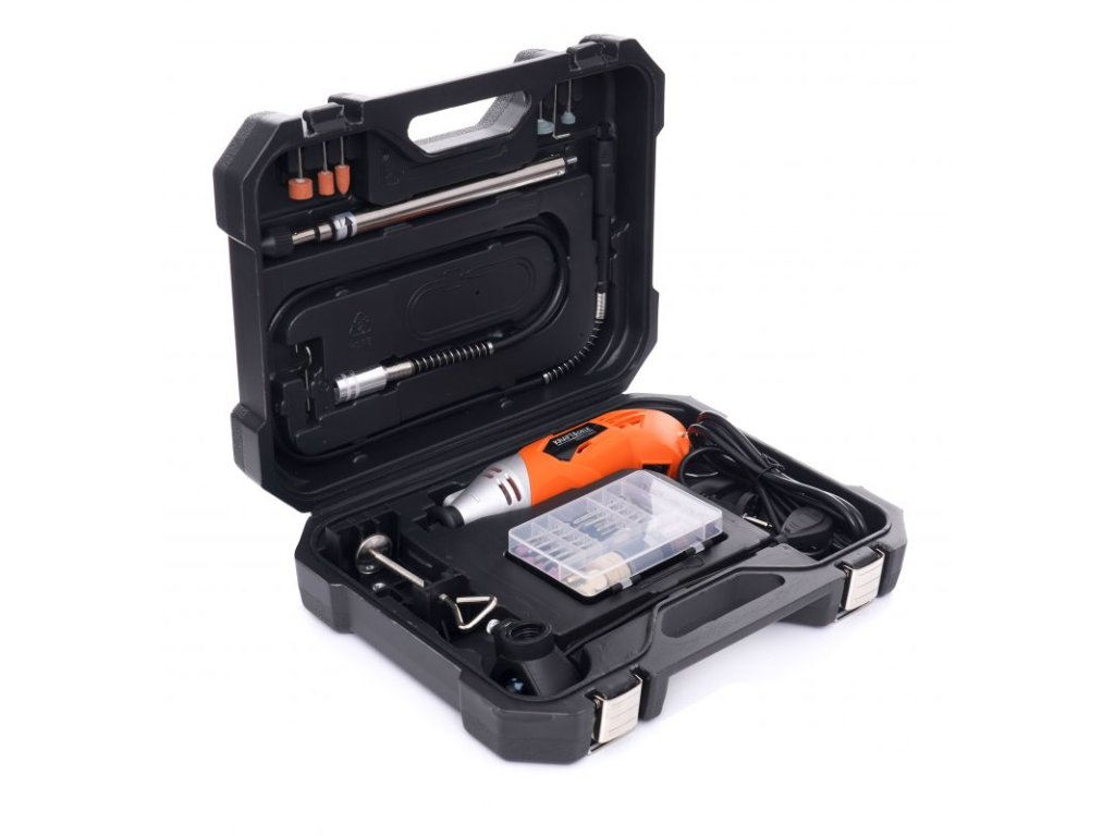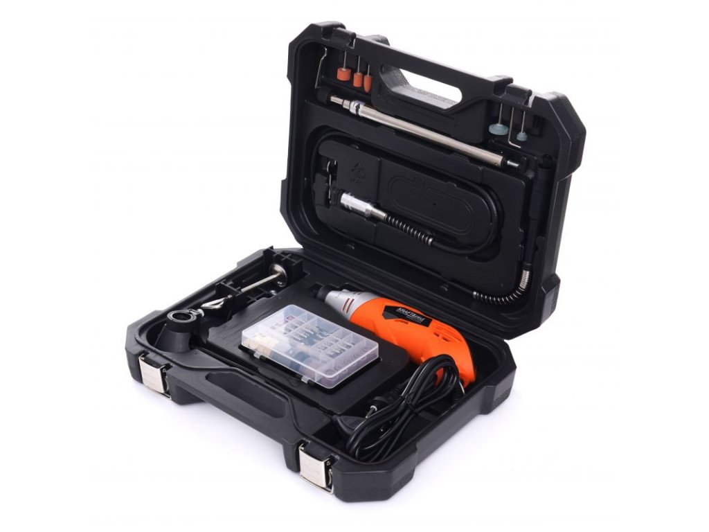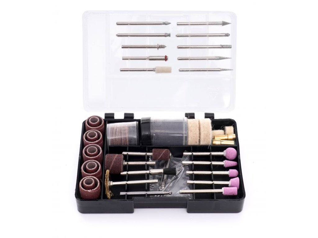 - 126 kusů příslušenství (gravírovací řezačka, redukce klínových kamenů, dláta, plsti, disky, vrtáky, kartáče …)