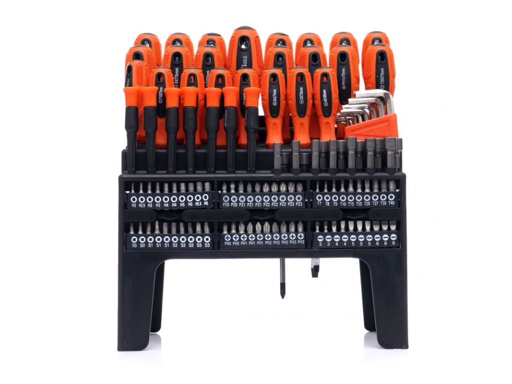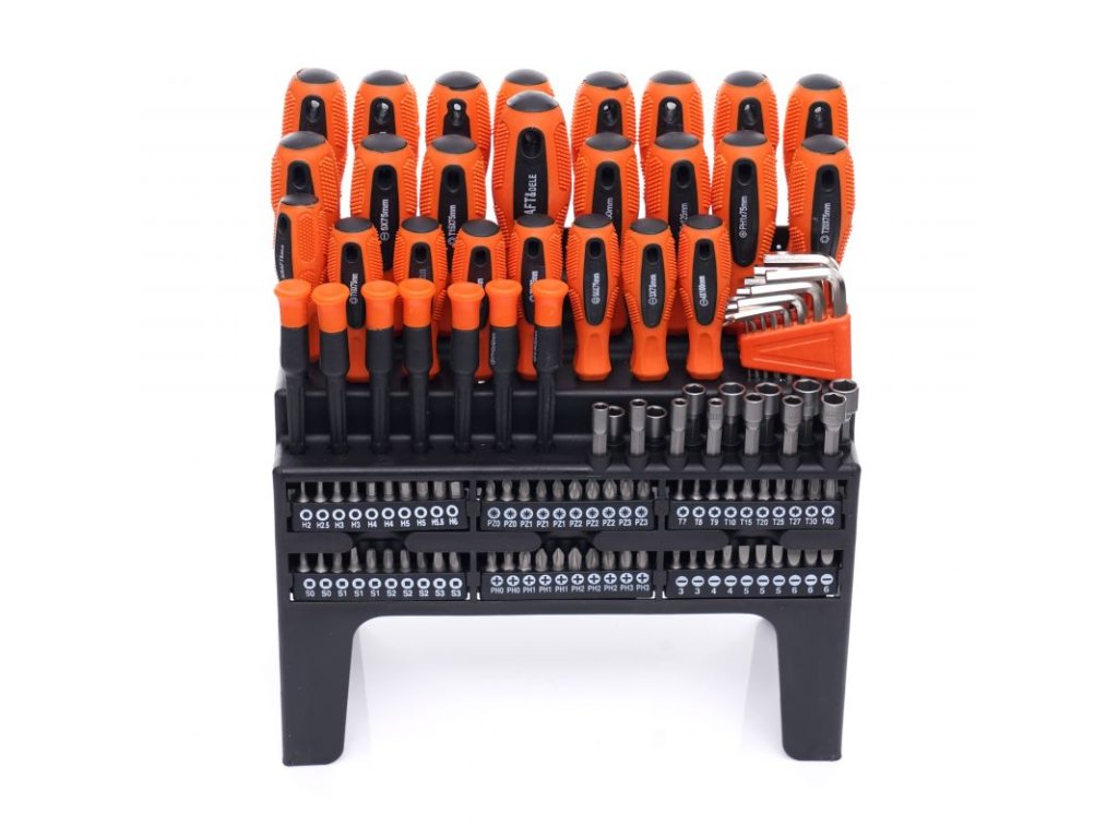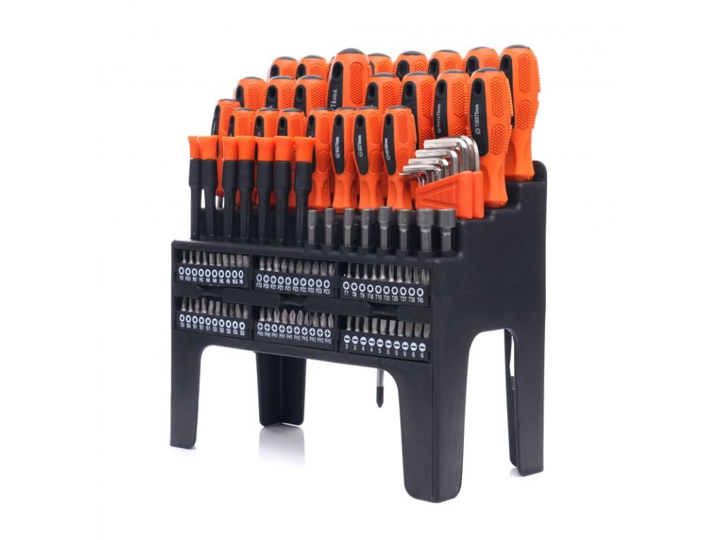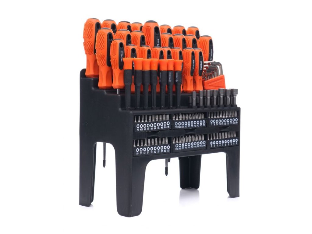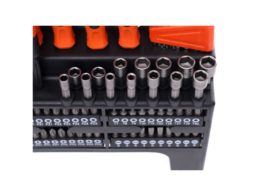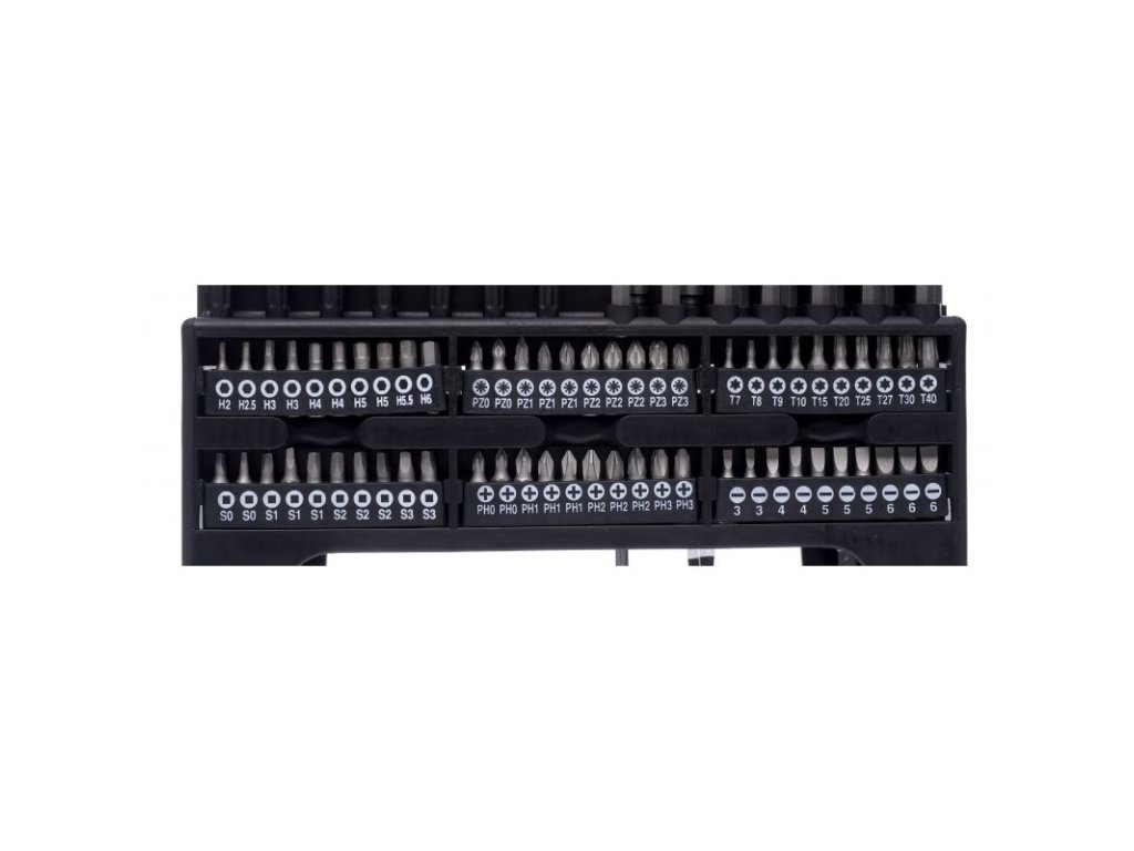 - Široká škála nástrojů: 122 kusů různých šroubováků a bitů