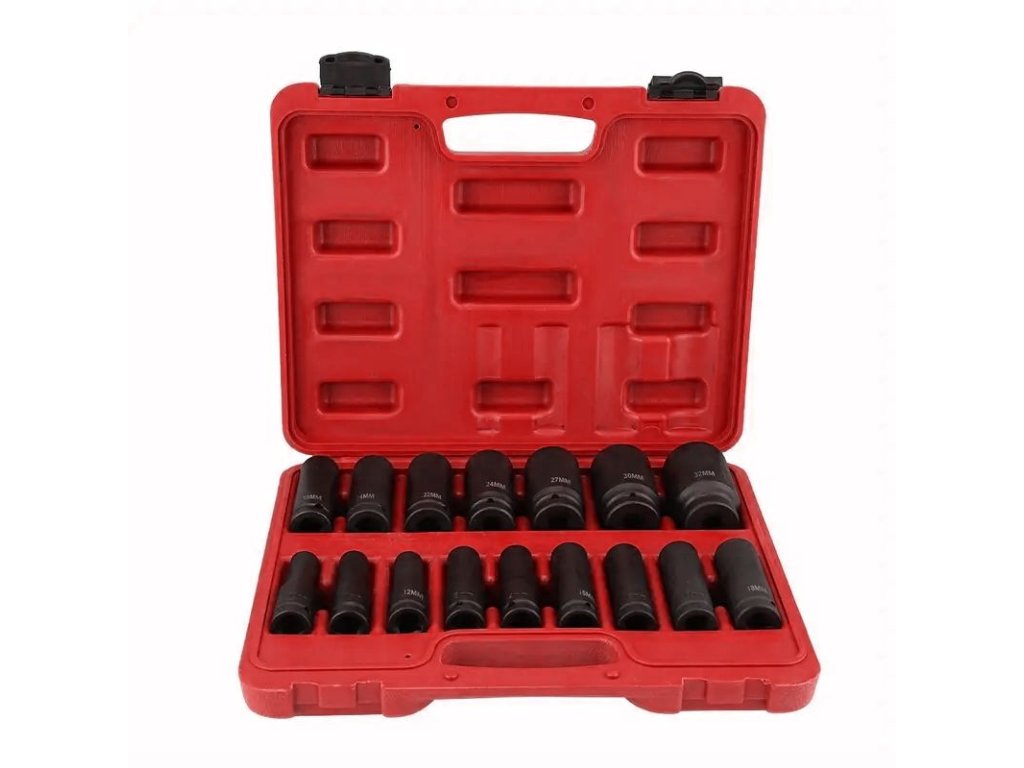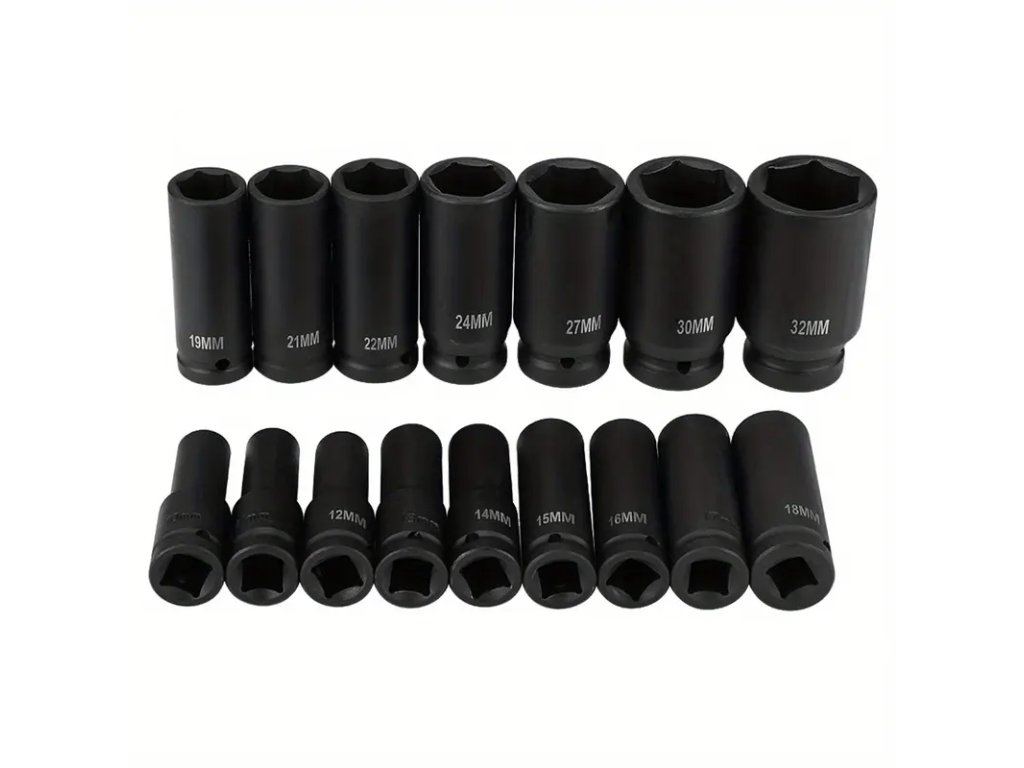 - Rázové hlavice 1/2" v následujících velikostech: 10 mm, 11 mm, 12 mm, 13 mm, 14 mm, 15 mm, 16 mm, 17 mm, 18 mm, 19 mm, 21 mm, 22 mm, 24 mm, 27 mm, 30 mm, 32 mm.