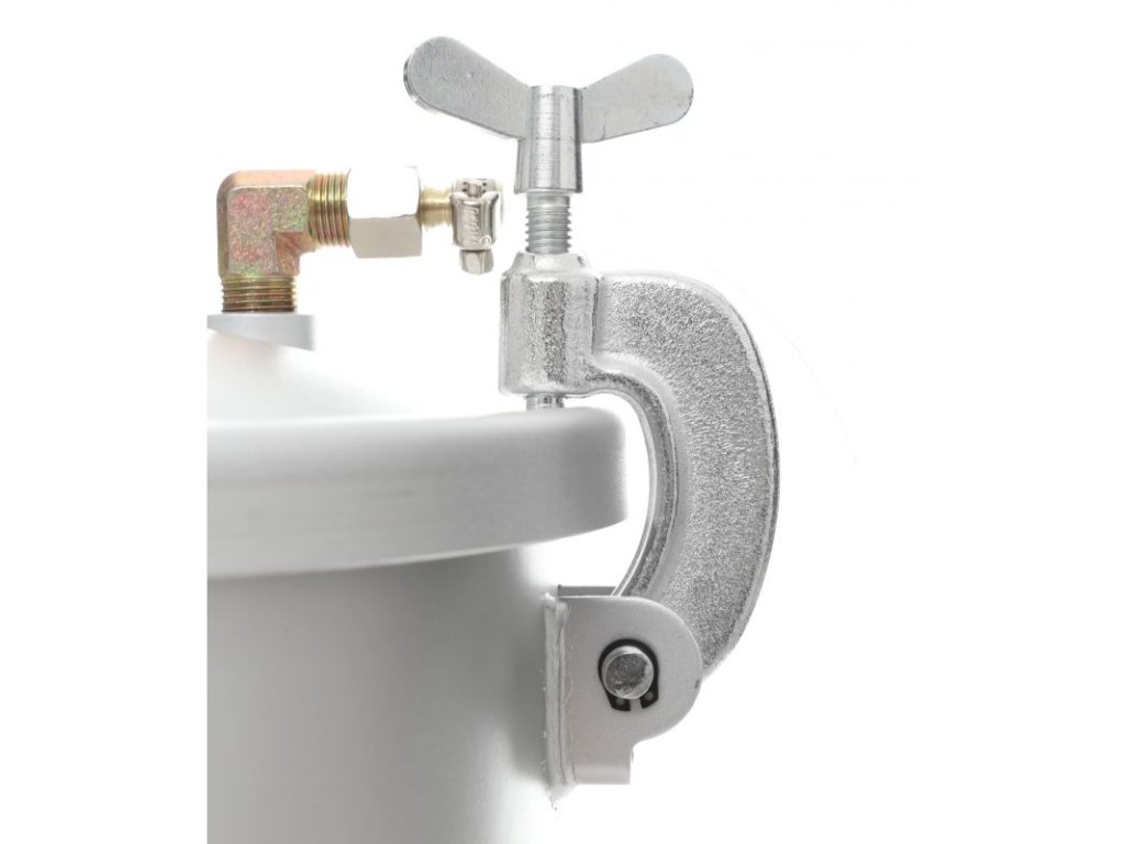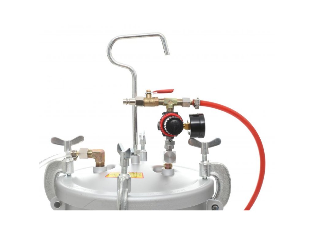 - Sada má 8 litrovou nádrž vyrobenou z hliníku, na jejímž víku je připevněn redukční ventil, manometr a pojistný ventil